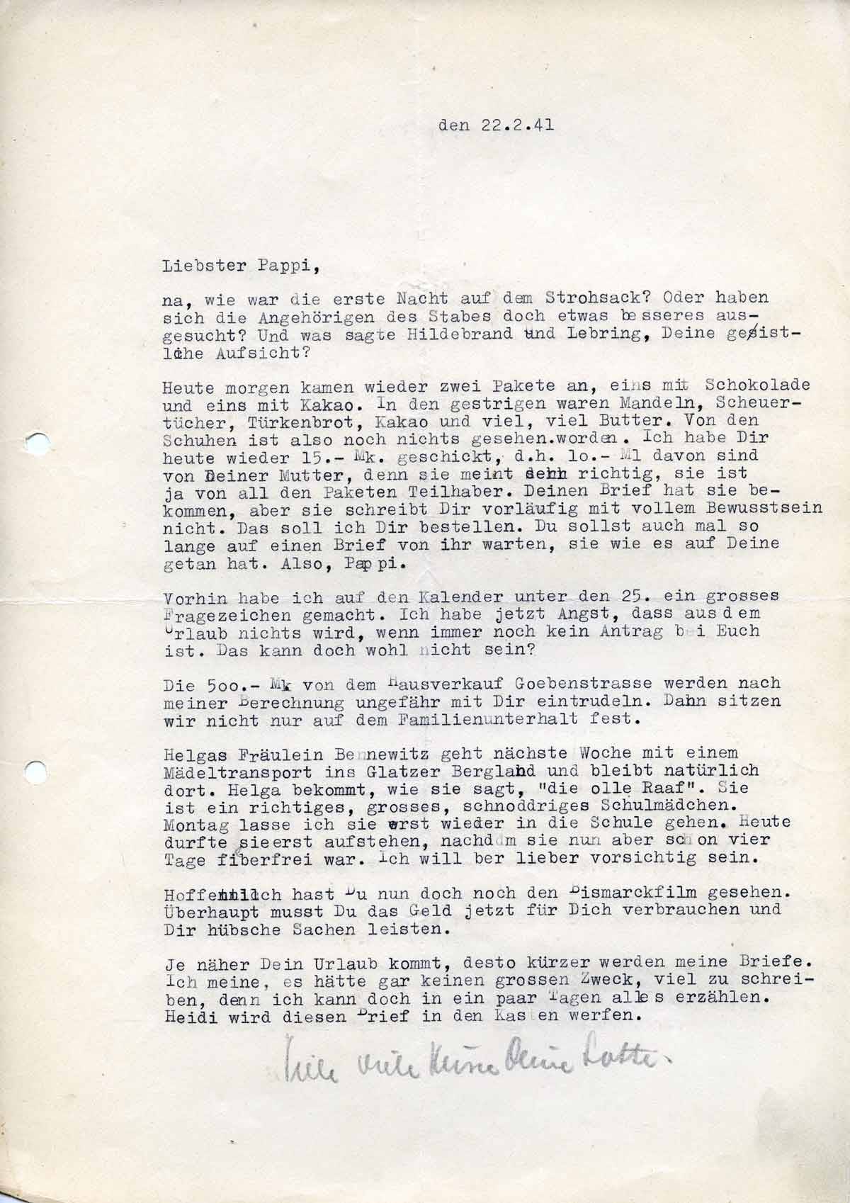 Charlotte Endemann an ihren Mann Harald, 22. Februar 1941
