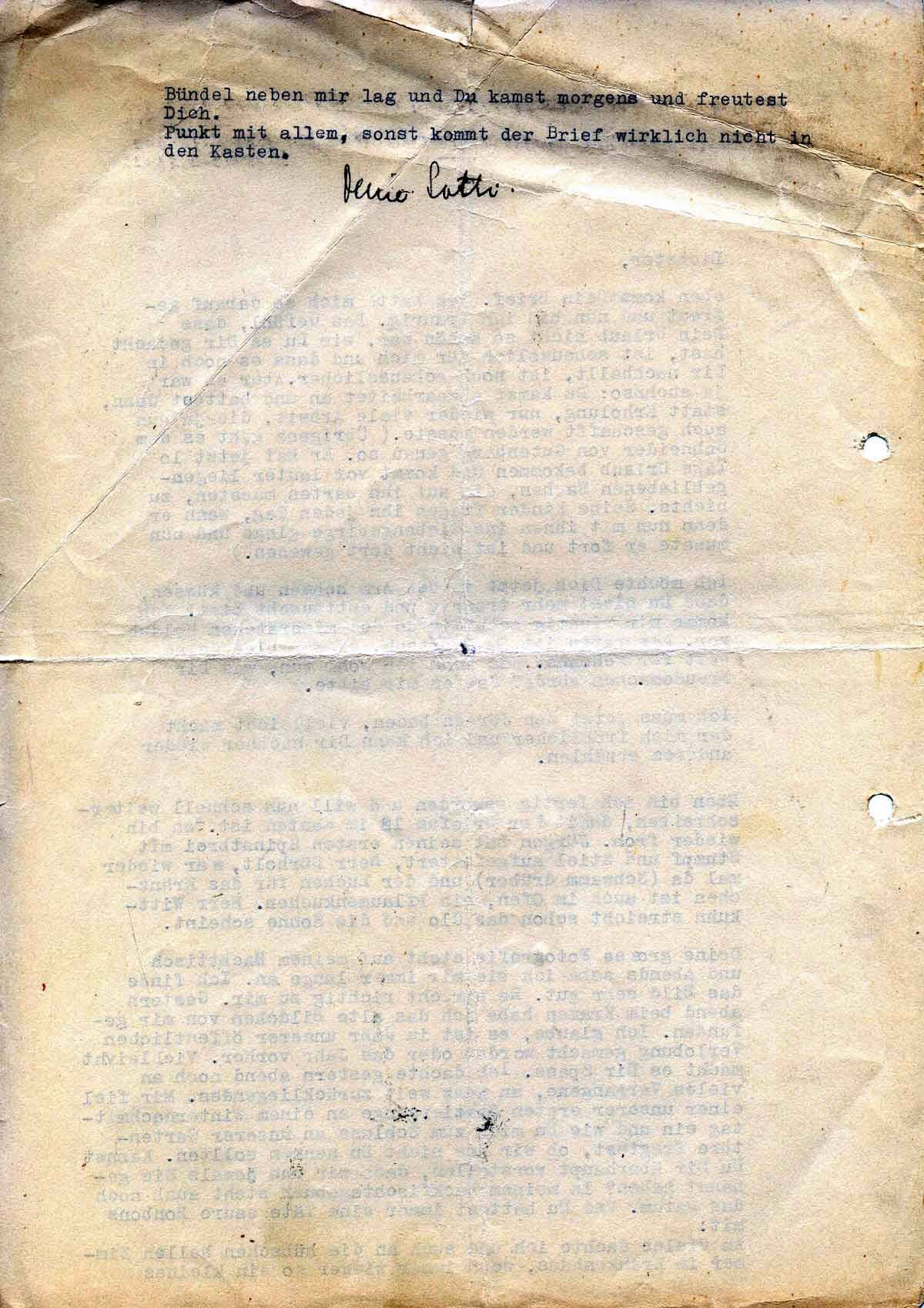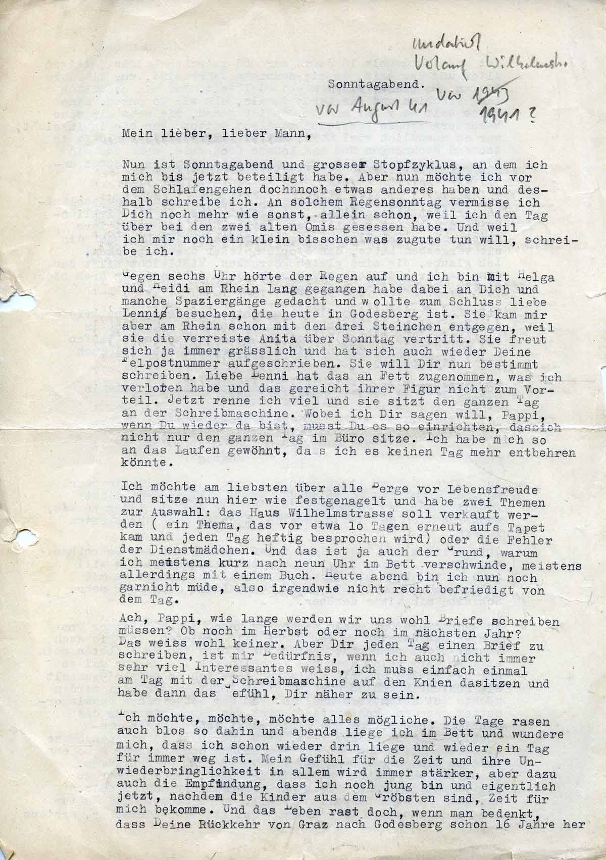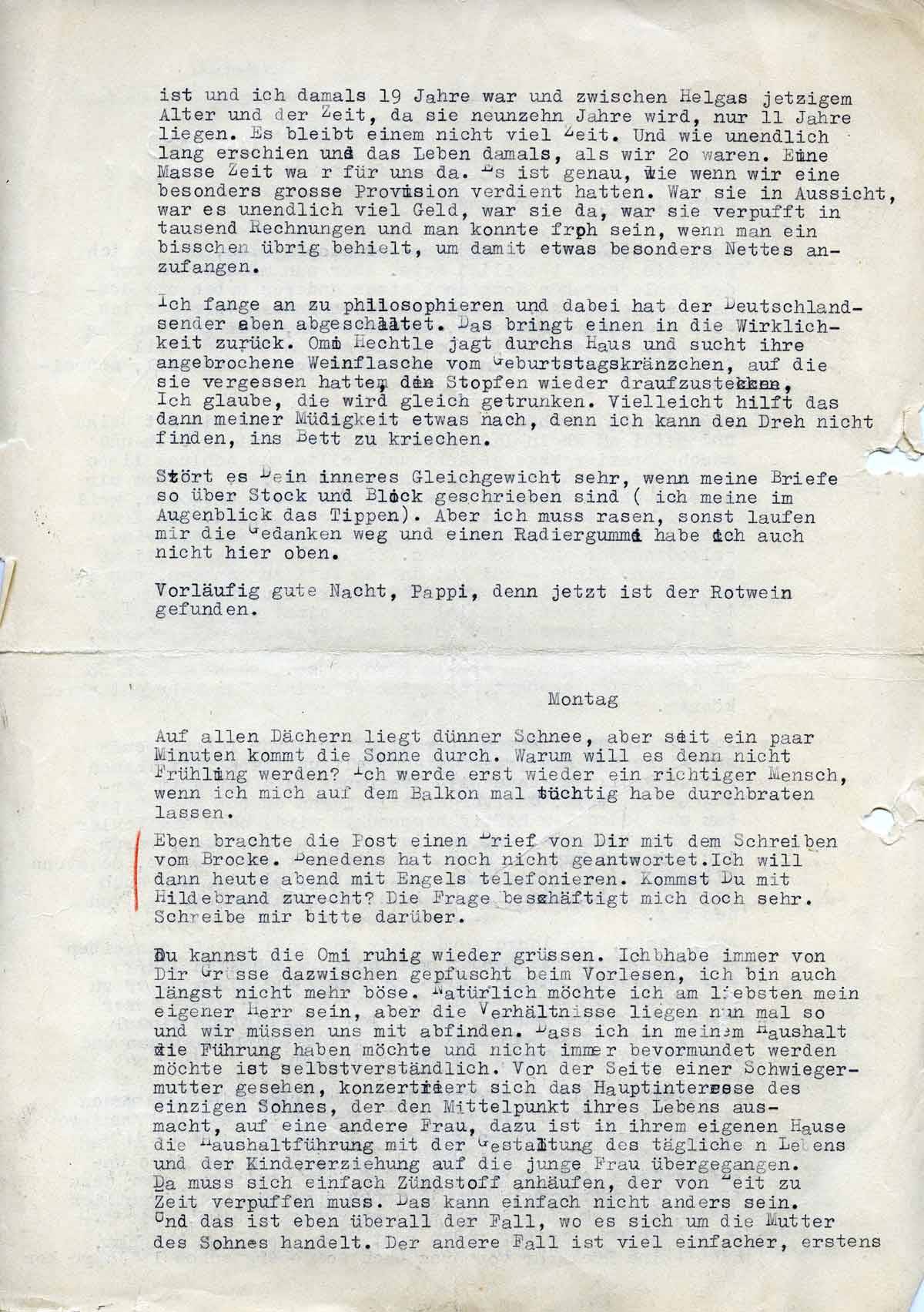 Und das ist auch der Grund, warum ich meistens kurz nach neun im Bett verschwinde mit einem Buch. Ach, Pappi, wie lange werden wir uns wohl noch Briefe schreiben müssen? Ob noch im Herbst oder noch im nächsten Jahr? Aber Dir jeden Tag einen Brief zu schreiben, ist mir Bedürfnis, wenn ich auch nicht immer sehr viel Interessantes weiß, ich muss einmal an Tag mit der Schreibmaschine auf den Knien dasitzen und habe dann das Gefühl, Dir näher zu sein.