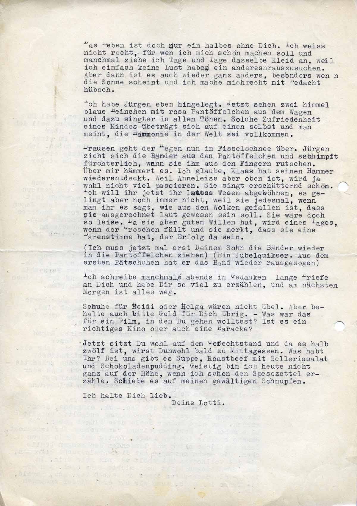 Dieser Sonntagmorgen gilt nun Deinem Brief. Das, was ich in der Küche vorzubereiten hatte, habe ich gestern abend gemacht, Jürgen hat seinen Spinat gegessen (mit großer Begeisterung übrigens) und sitzt in seinem Wagen bei mir im Wohnzimmer, ein himmelblaues, rosigsauberes Paketchen, das auf seinen kommenden Eckzähnchen kaut. Helga und Heidi sind im Film. 'Der kleine Häwelmann' wird gegeben, und Helga war völlig aufgeregt, als sie den Titel las.