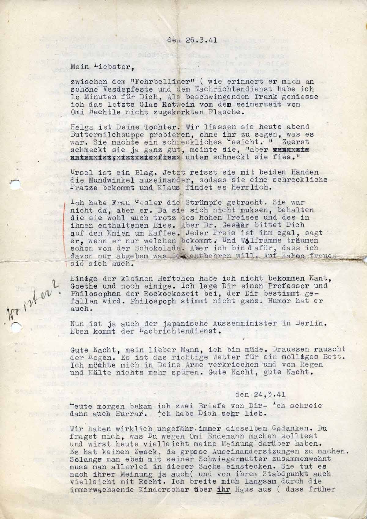 Charlotte Endemann an ihren Mann Harald, 26. März 1941