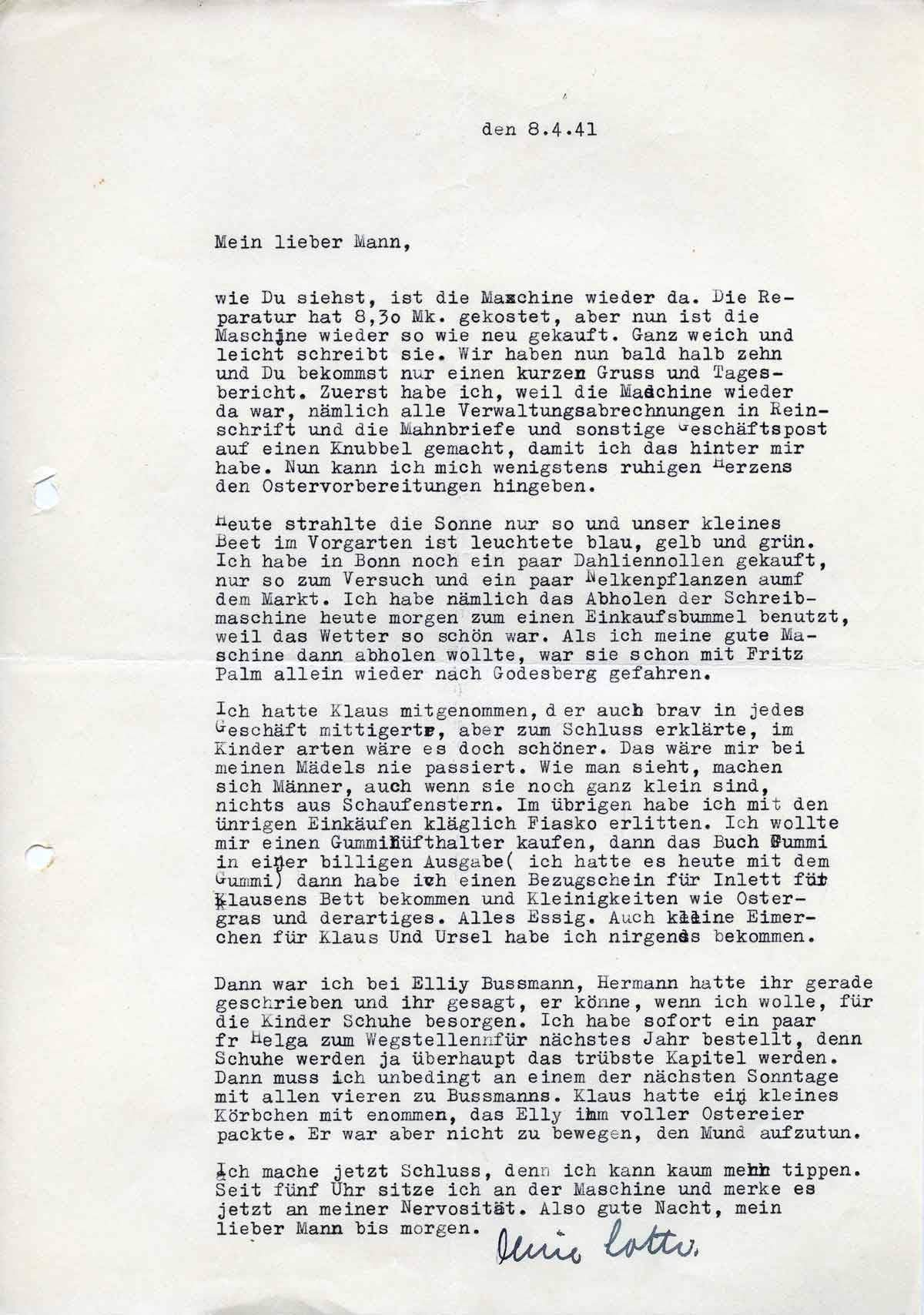 Ich mache jetzt Schluss, denn ich kann kaum mehr tippen. Seit fürf Uhr sitze ich an der Maschine und merke es jetzt an meiner Nervosität. Also gute Nacht, mein lieber Mann, bis morgen! Deine Lotti