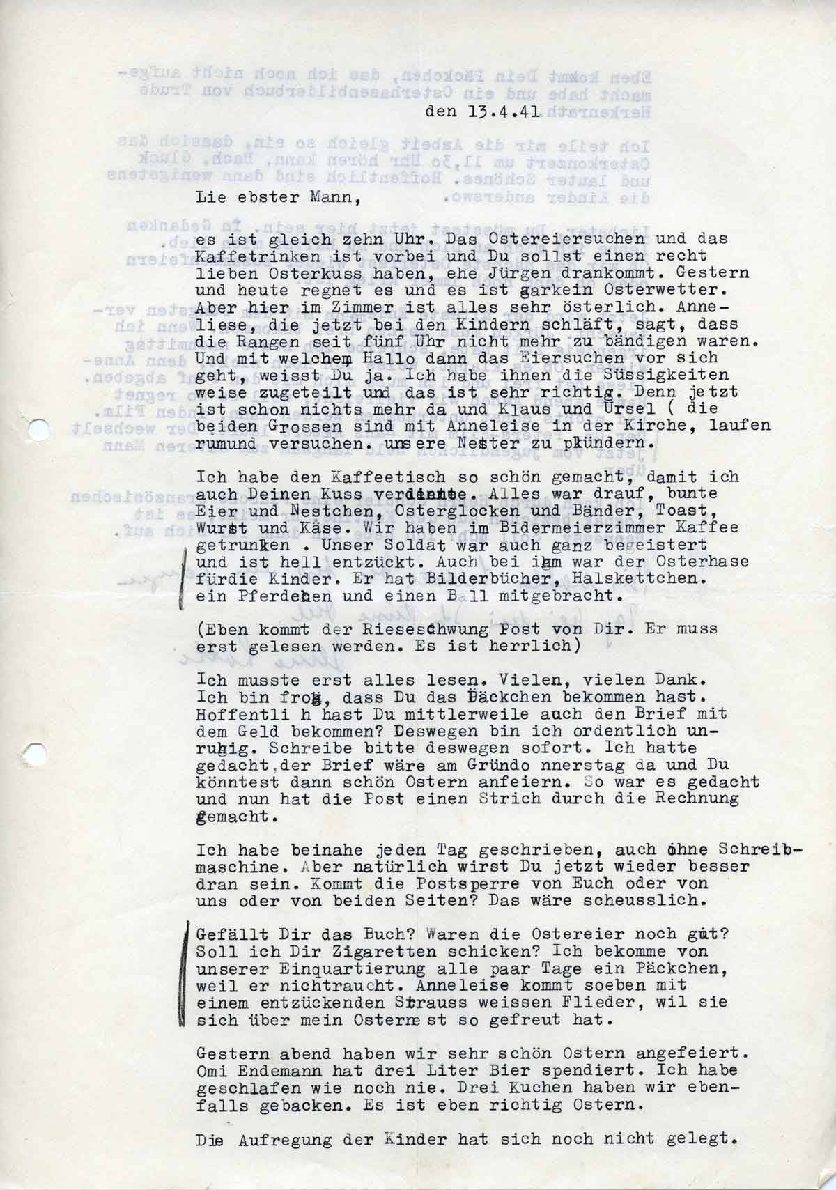 Charlotte Endemann an ihren Mann Harald, 13. April 1941