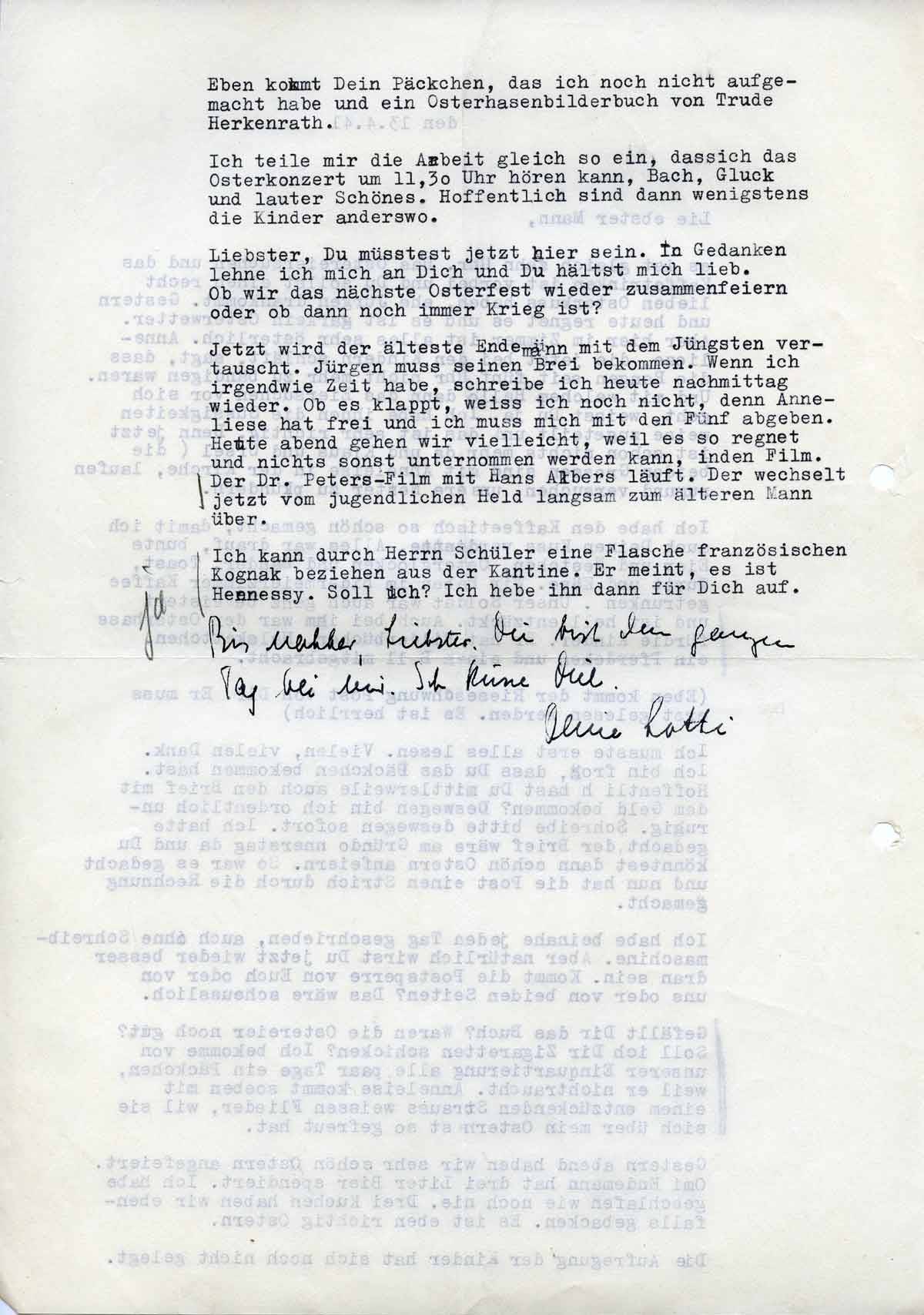 Es ist gleich zehn Uhr. Das Ostereiersuchen und das Kaffeetrinken ist vorbei, und Du sollst einen recht lieben Osterkuss haben, ehe Jürgen drankommt. Gestern und heute regnet es, und es ist gar kein Osterwetter. Aber hier im Zimmer ist alles sehr festlich. Anneliese, die jetzt bei den Kindern schläft, sagt, dass die Rangen seit fünf Uhr nicht mehr zu bändigen waren. Und mit welchem Hallo dann das Eiersuchen vor sich ging, weißt Du ja. Ich habe ihnen die Süßigkeiten weise zugeteilt und das ist sehr richtig. Denn jetzt ist schon nichts mehr da, und Klaus und Ursel (die beiden Großen sind mit Anneliese in der Kirche) laufen rum und versuchen, unsere Nester zu plündern.