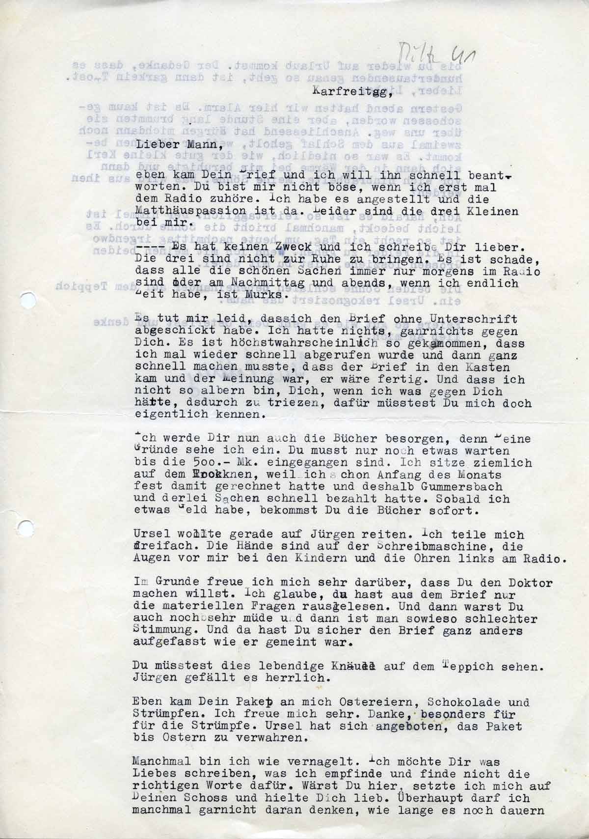 eben kam Dein Brief und ich will ihn schnell beantworten. Du bist mir nicht böse, wenn ich erst mal dem Radio zuhöre. Ich habe es angestellt und die Matthäuspassion ist da. Leider sind die drei Kleinen bei mir.