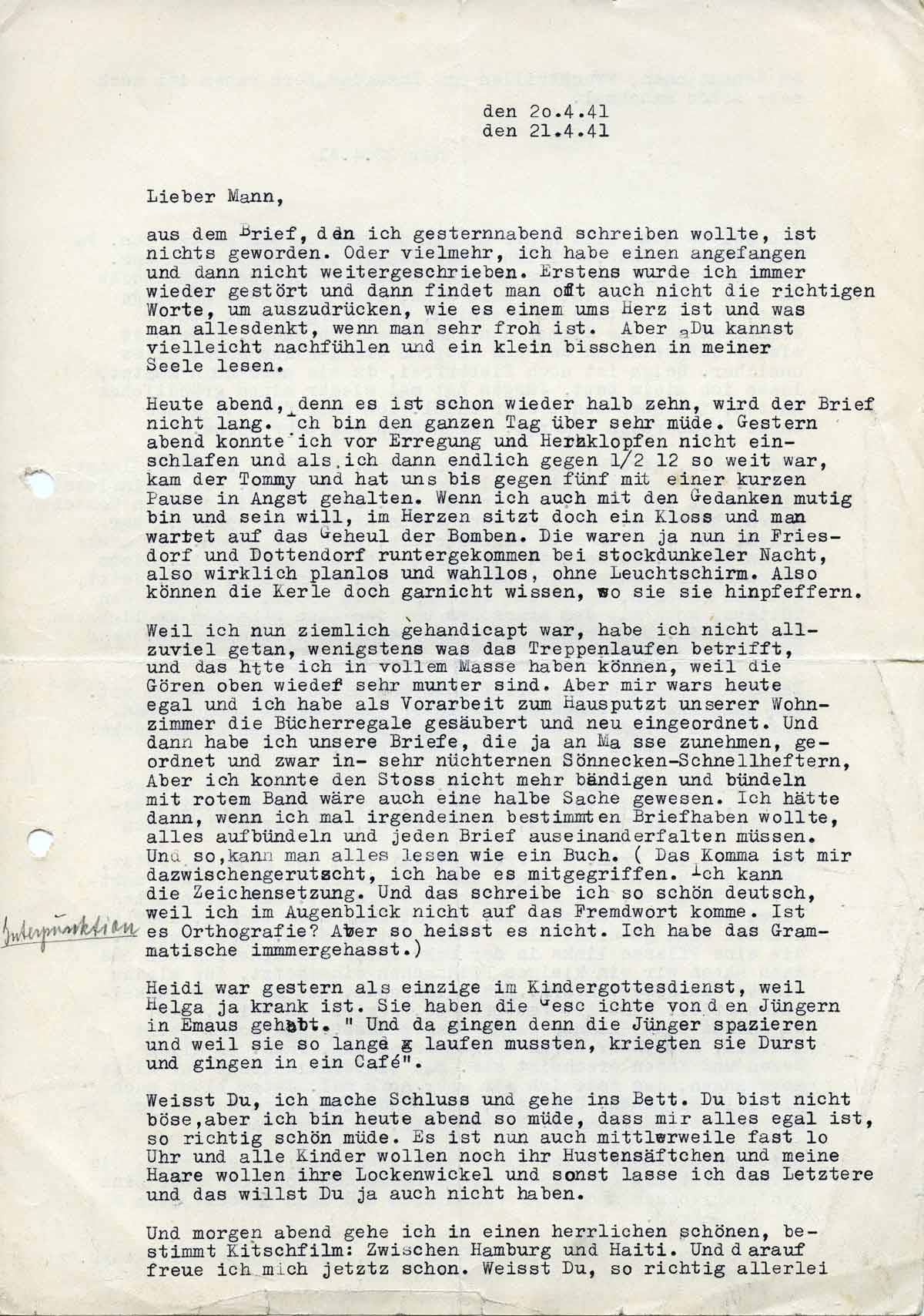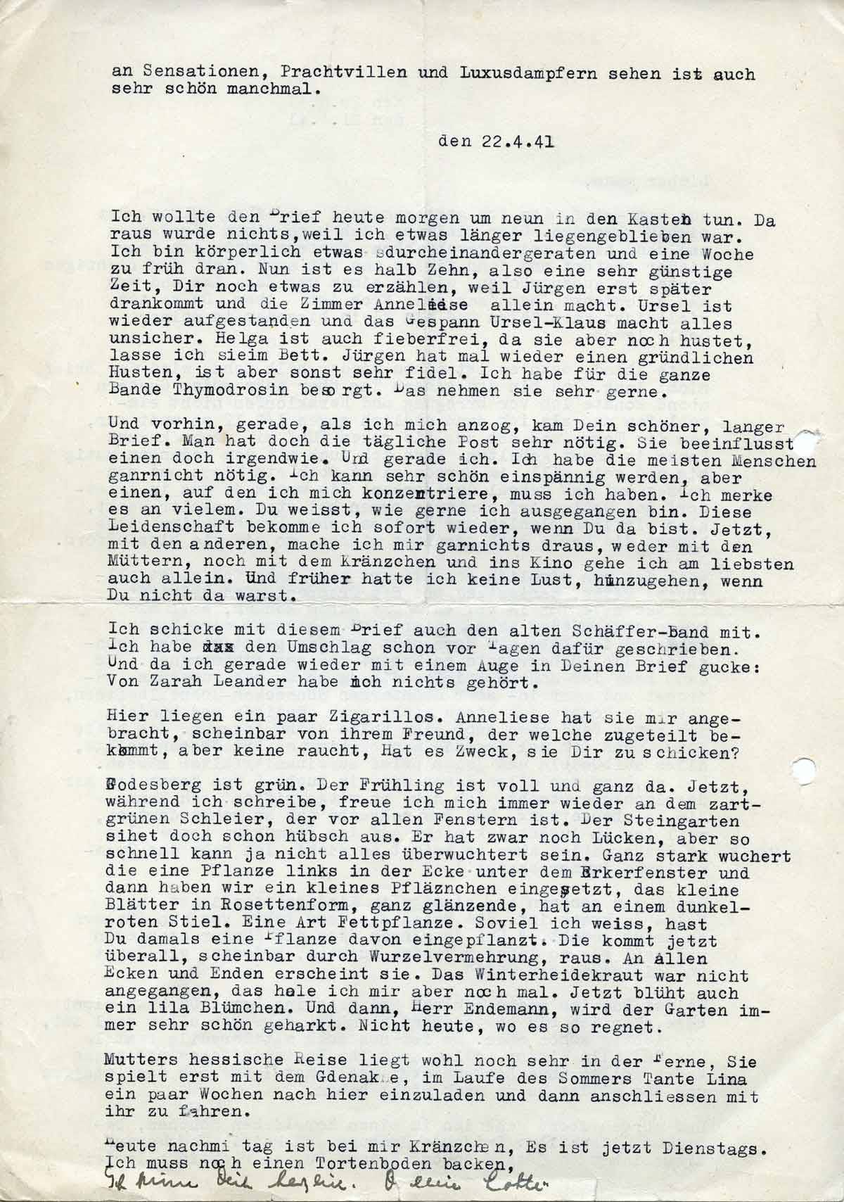 Charlotte Endemann an ihren Mann Harald, 21. April 1941