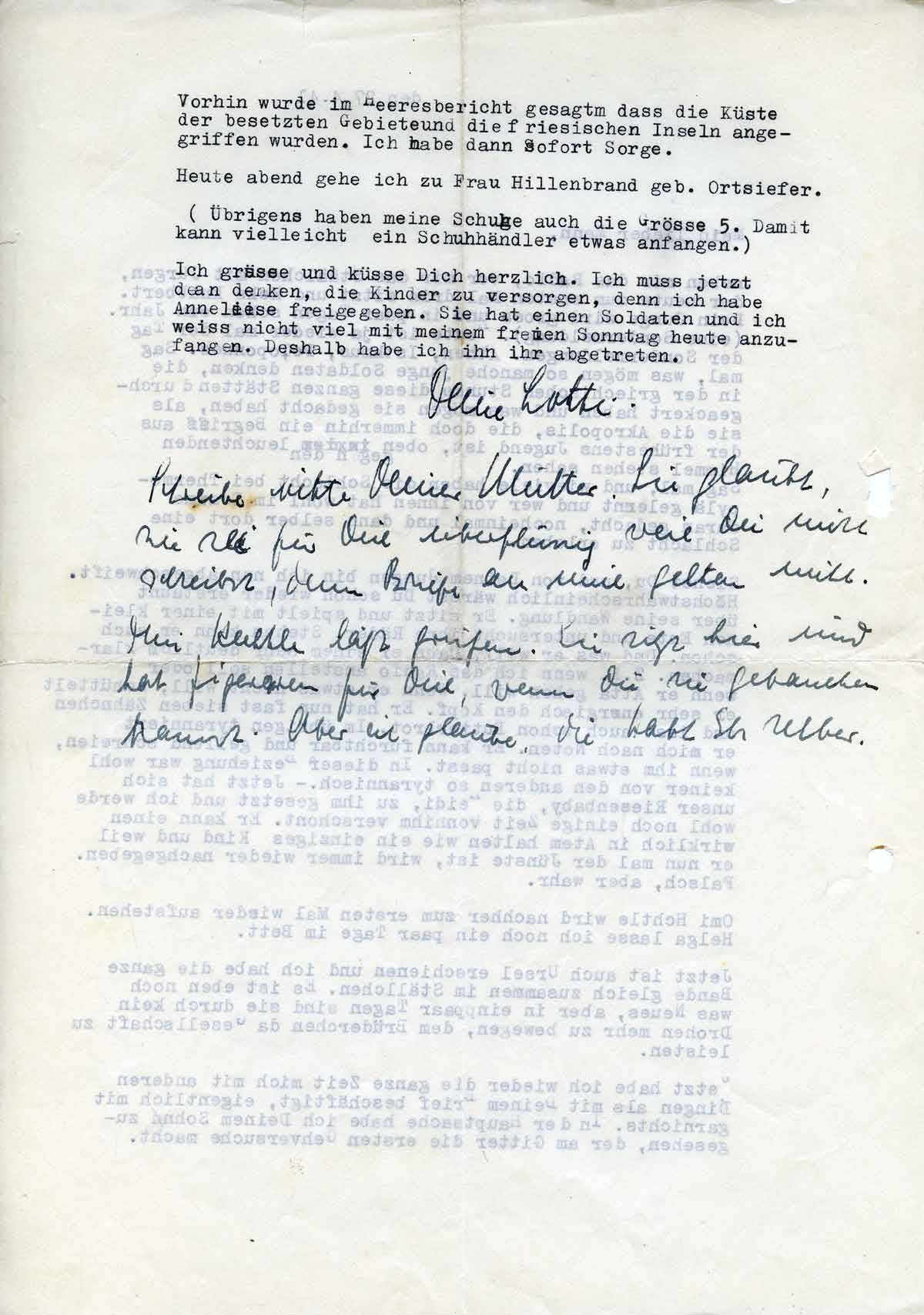 Ich grüsse und küsse Dich herzlich. Ich muss jetzt daran denken, die Kinder zu versorgen, denn ich habe Anneliese freigeegeben. Sie hat einen Soldaen und ich weiss nicht viel mit meinem freien Sonntag heute anzufangen. Deshalb habe ich ihn ihr abgetreten.