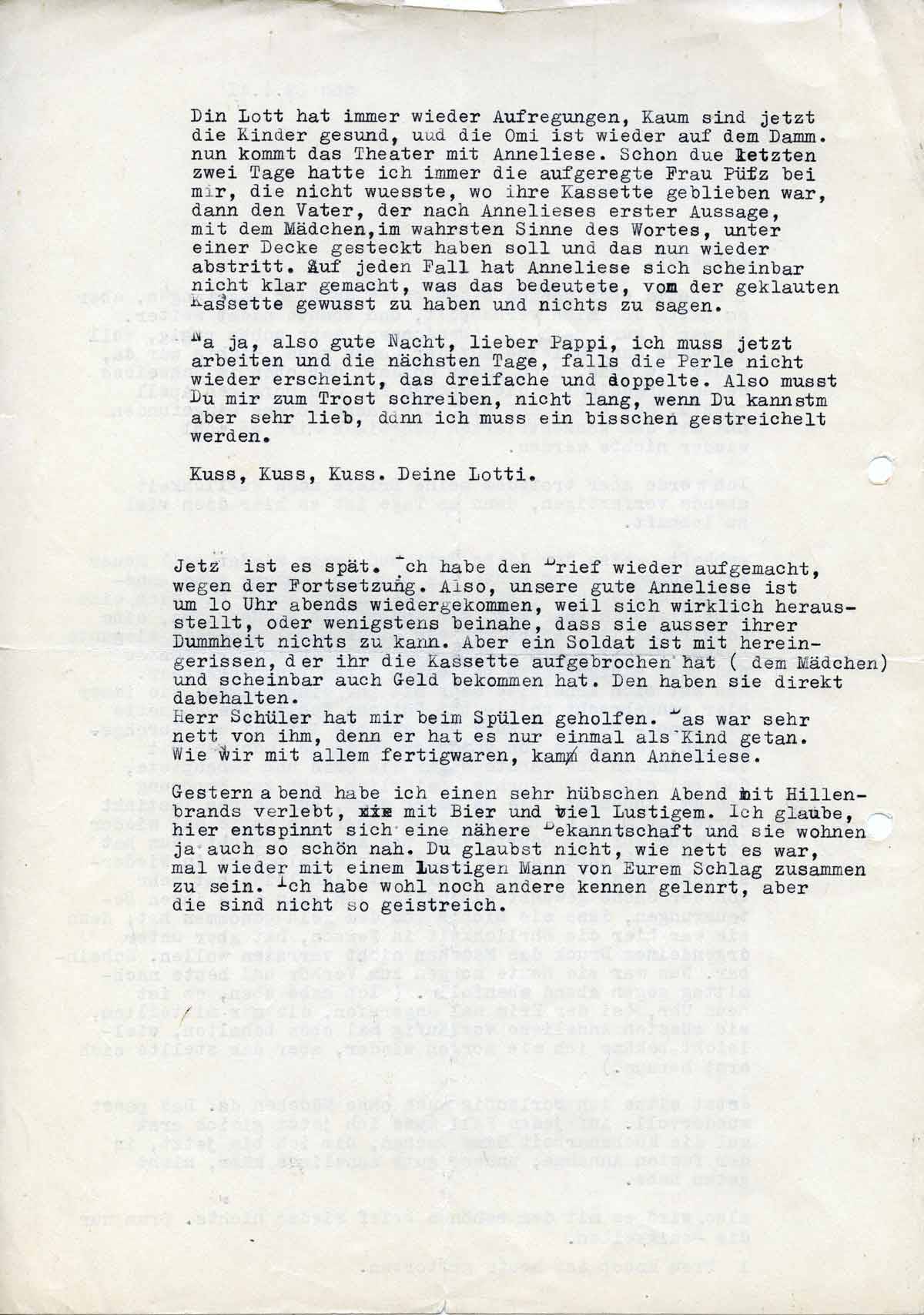 Jetzt ist es spät. Ich habe de Brief wieder aufgemacht, wegen der Fortsetzung. Also, unsere gute Anneliese ist um 10 Uhr abends wiedergekommen, weil sich wirklich herausstellt, oder wenigstens beinahe, dass sie ausser ihrer Dummheit nichts zu kann. Aber ein Soldat ist mit hereingerissen, der ihr die Kassette aufgebrochen hat (dem Mädchen) und scheinbar auch Geld bekommen hat. Den haben sie direkt dabehalten.
