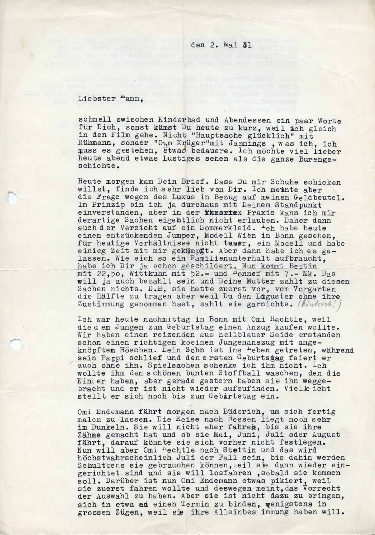 Charlotte Endemann an ihren Mann Harald, 2. Mai 1941
