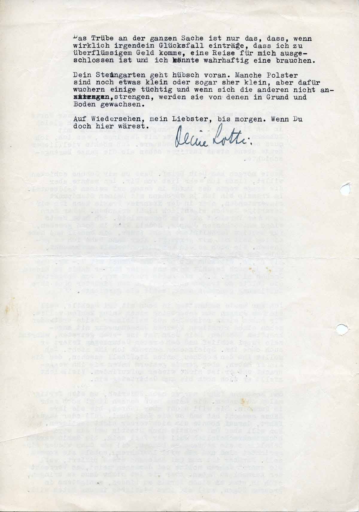 Dein Steingarten geht hübsch voran. Manche Polster sind noch etwas klein, aber dafür wuchern einige tüchtig, und wenn die anderen sich nicht anstrengen, werden sie in Grund und Boden gewachsen. Auf Wiedersehen mein Liebster, bis morgen. Wenn Du doch hier wärest. Deine Lotti
