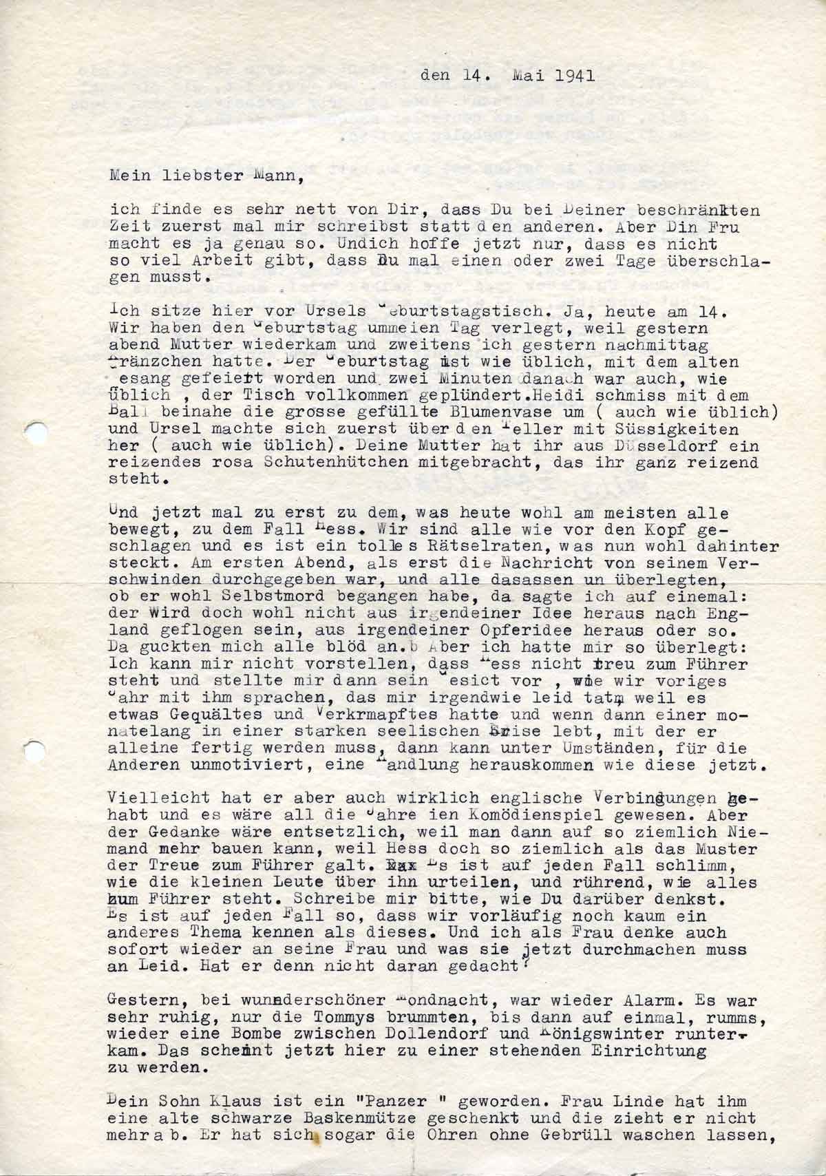 Vielleicht hat er aber auch wirklich englische Verbindungen gehabt, und es wäre alle die Jahre ein Komödienspiel gewesen. Aber dann kann man auf niemand mehr bauen, weil Hess ja als das Muster der Treue zum Führer galt. Es ist auf jeden Fall schlimm, wie die kleinen Leute über ihn urteilen, und rührend, wie alles zum Führer steht. Schreibe mir, wie Du darüber denkst. Es ist auf jeden Fall so, dass wir hier kaum ein anderes Thema kennen. Und ich denke auch, was seine Frau jetzt durchmachen muss an Leid. Hat er denn nicht daran gedacht?