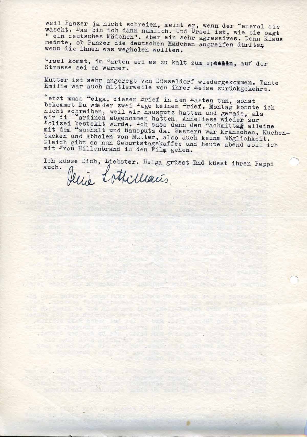 Jetzt muss Helga diesen Brief in den Kasten tun, sonst bekommst Du wieder zwei Tage keinen Brief. Montag konnte ich nicht schreiben, weil wir Hausputz hatten und gerade, als wir die Gardinen abgenommen hatten, Anneliese wieder zur Polizei bestellt wurde. Ich sass dann den Nachmittag alleine mit dem Haushalt und Hausputz da. Gestern war Kränzchen, Kuchenbacken und Abholen von Mutter, also auch keine Möglichkeit. Gleich gibt es nun Geburtstagskaffee, und heute abend soll ich mit Frau Hillenbrand in den Film gehen.
