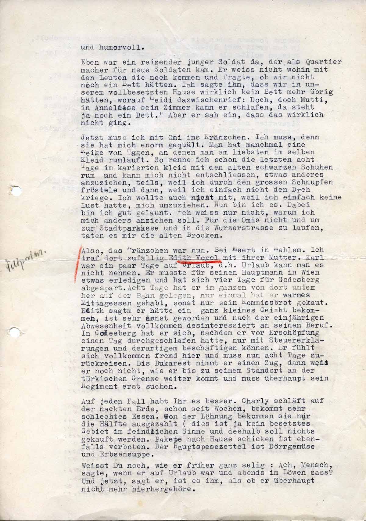 Also, das Kränzchen war nun bei Meert in Mehlem. Ich traf dort zufällig Edith Vogel mit ihrer Mutter. Karl war ein paar Tage auf Urlaub, d.h., Urlaub kann man es nicht nennen. Er musste für seinen Hauptmann in Wien etwas erledigen und hat sich vier Tag für Godesberg abgespart. Acht Tage hat er im Ganzen von dort unten auf der Bahn gesessen, nur einmal hat er warmes Mittagessen gehabt, sonst nur sein Kommissbrot gekaut. Edith sagte, er hätte ein ganz kleines Gesicht bekommen, ist sehr ernst geworden, und nach der einjährigen Abwesenheit völlig desinteressiert an seinem Beruf.