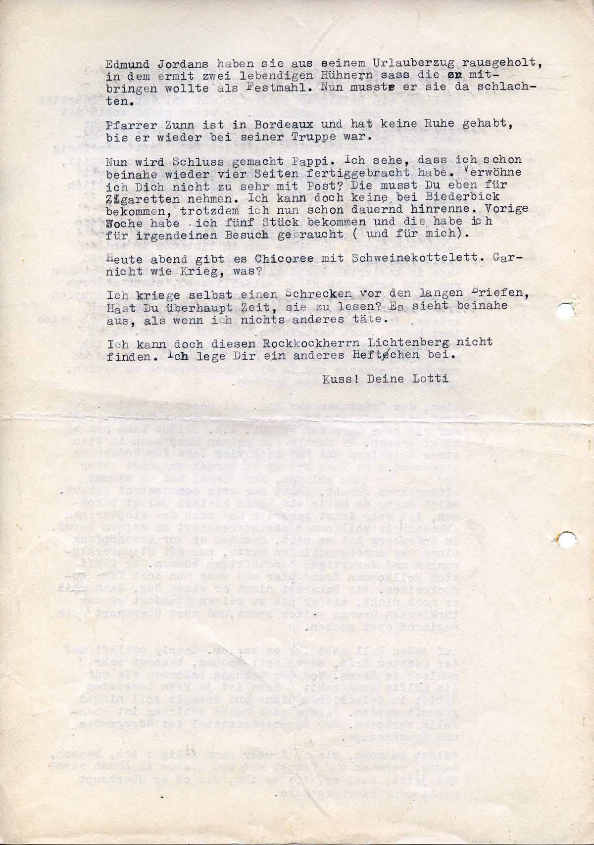 Nun wird Schluss gemacht Pappi. Ich sehe, dass ich beinahe schon wieder vier Seiten fertiggebracht habe. Verwöhne ich Dich nicht zu sehr mit Post? Die musst Du eben für Zigaretten nehmen. Ich kann doch keine bei Biederbick bekommen, trotzdem ich schon dauernd hinrenne. Vorige Woche habe ich fünf Stück bekommen, und die habe ich für irgendeinem Besuch gebaucht (und für mich). Heute abend gibt es Chicoree mit Schweinekotelett. Gar nicht wie Krieg, was?
