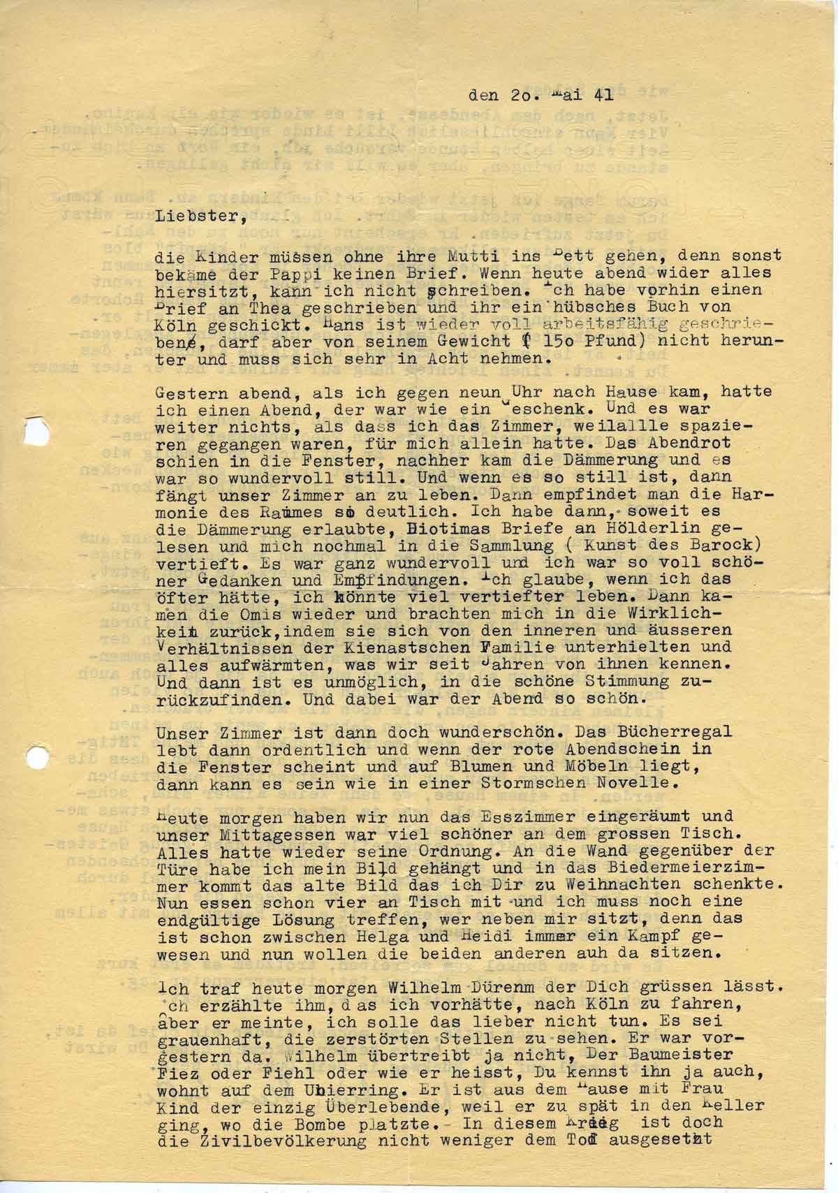 Ich traf heute morgen Wilhelm Düren, der Dich grüßen lässt. Ich erzählte ihm, dass ich vor-hätte, nach Köln zu fahren, aber er meinte, ich solle das lieber nicht tun. Es sei grauenhaft, die zerstörten Straßen zu sehen. Er war vorgestern da. Wilhelm übertreibt ja nicht. Der Baumeister Fitz oder Fihl, Du kennst ihn ja auch, wohnt auf dem Ubierring. Er ist aus dem Hause mit Frau und Kind der einzig Überlebende, weil er zu spät in den Keller ging, wo die Bombe platzte. In diesem Krieg ist doch die Zivilbevölkerung nicht weniger dem Tod ausgesetzt