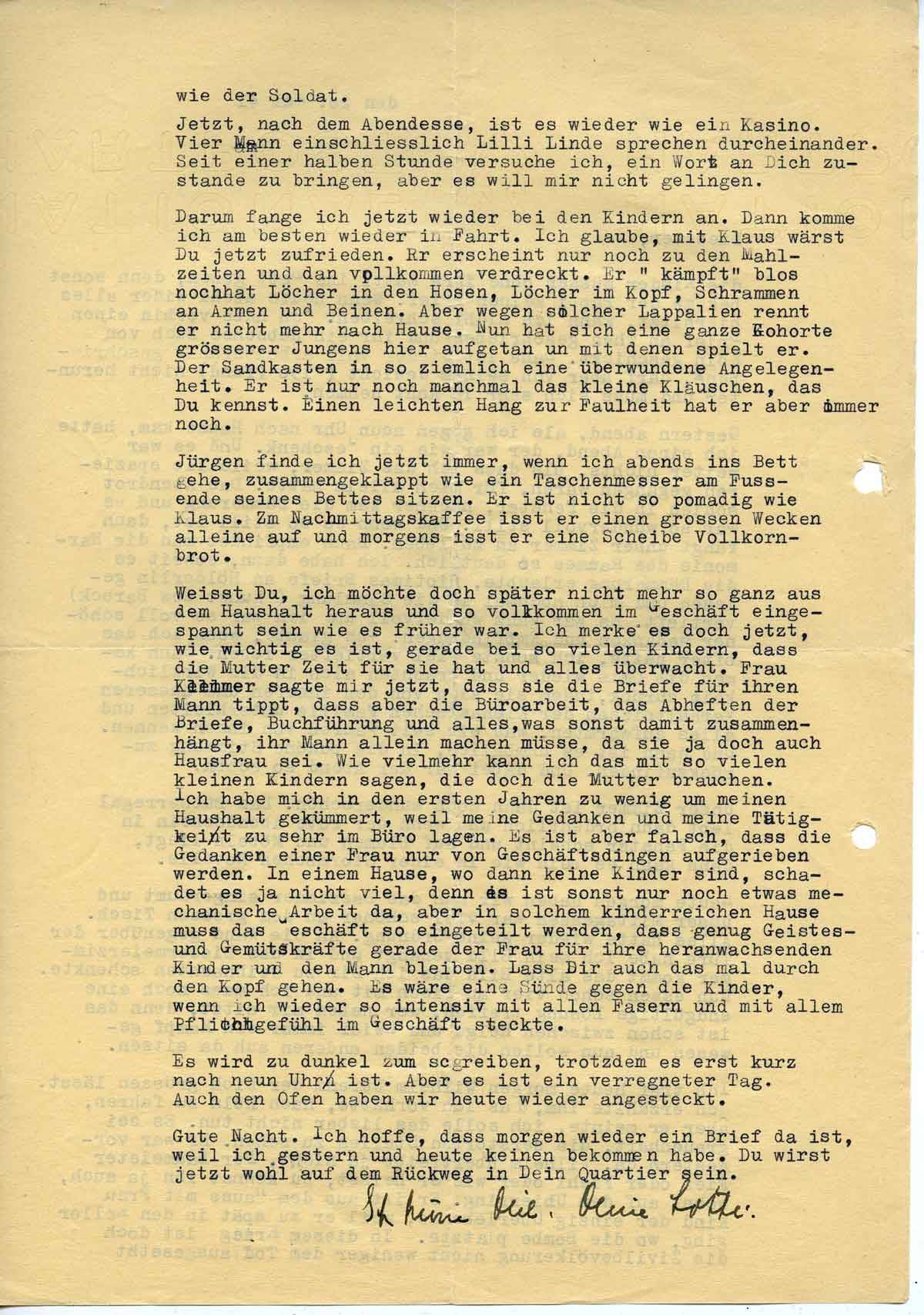Weisst Du, ich möchte doch später nicht mehr so ganzh aus dem Haushalt heraus und so vollkommen im Geschäft eingespannt sein wie es früher war. ich merke es doch jetzt, wie wichtig es ist, gerade bei so vielen kindern, dass die Mutter Zeit für sie hat und alles überwacht. Frau Kellmer sagte mir jetzt, dass sie die Briefe für ihren mann tippt, dass aber die Büroarbeit, das Abheften der Briefe, Buchführung und alles, was sonst damit zusammenhängt, ihr Mann allein machen müsse, da sie ja doch auch Hausfrau sei. Wie vielmehr kann ich das mit so vielen kleinen Kindern sagen, die doch die Mutter brauchen. Ich habe mich in den ersten jahren zu wenig um meinen Haushalt gekümmert, weil meine Gedanken und meine Tätigkeit zu sehr im Büro lagen. Es ist aber falsch, dass die Gedanken einer Frau nur von Geschäftsdingen aufgerieben werden. In einem Hause, wo dann keine Kinder sind, schadet es ja nicht viel, denn es ist sonst nur noch etwas mechanische Arbeit da,, aber in solchem kinderreichen Hause muss das geschäft so eingeteilt werden, dass genug geistes- und Gemütskräfte gerade der Frau für ihre heranwachsenden kinder und den Mann bleiben. Lass Dir auch das mal durch den Kopf gehen. Es wäre eine Sünde gegen die Kinder, wenn ich wieder so intensiv mit allen Fasern und mit allem Pflichtsgefühl im Geschäft steckte.