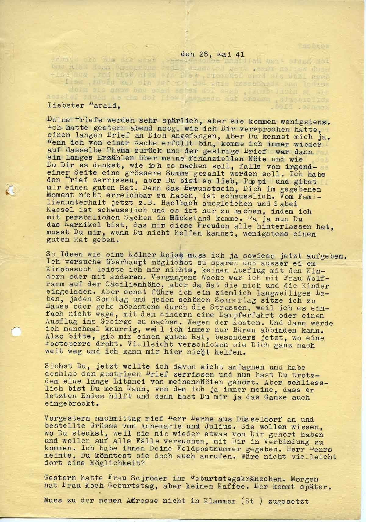 Charlotte Endemann an ihren Mann Harald, 28. Mai 1941