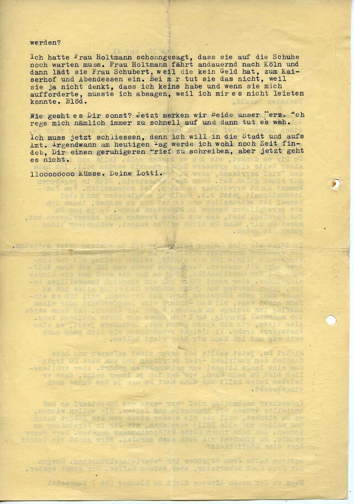 Ich muss jetzt schließen, denn ich muss in die Stadt und aufs Amt. Irgendwann am heutigen Tag werde ich wohl noch Zeit finden, Dir einen ruhigeren Brief zu schreiben, aber jetzt geht es nicht. 110000000 Küsse, Deine Lotti.