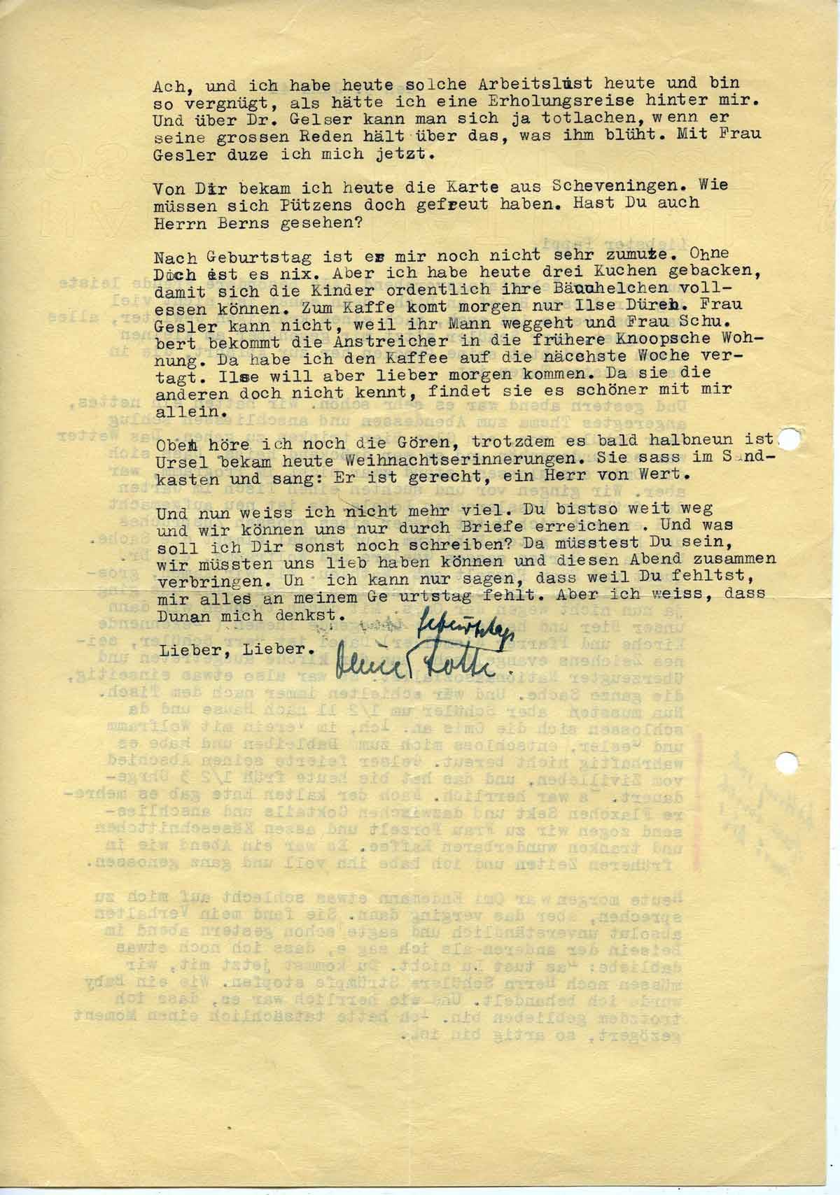 Nach Geburtstag ist es mir noch nicht zumute. Ohne Dich ist es nix. Aber ich habe heute drei Kuchen gebacken, damit sich die Kinder ordentlich ihre Bäuchelchen vollessen können. Zum Kaffee kommt morgen nur Ilse Düren. Frau Gesler kann nicht, weil ihr Mann weggeht, und Frau Schubert bekommt die Anstreicher in die frühere Knoopsche Wohnung. Da habe ich den Kaffee auf die nächste Woche verlegt. Ilse will aber lieber morgen kommen. Da sie die anderen doch nicht kennt, findet sie es schöner mit mir allein.