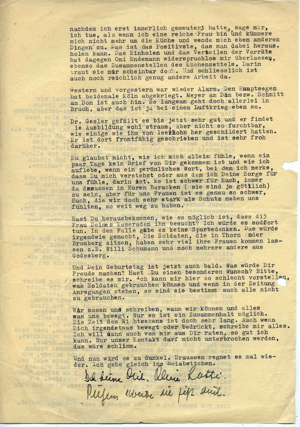 Gestern und vorgestern war wieder Alarm. Den Hauptsegen hat beidemal Köln abgekriegt. Meyer am Dom bezw. Schmitt am Dom ist auch hin. So langsam geht doch allerlei in Bruch, aber das ist ja bei einem Luftkrieg eben so..