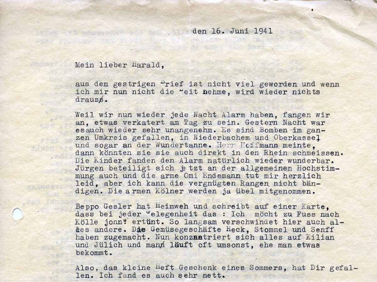 Weil wir nun wieder jede Nacht Alarm haben, fangen wir an, etwas verkatert am Tag zu sein. Gestern Nacht war es auch wieder sehr unangenehm. Es sind Bomben im ganzen Umkreis gefallen, in Niederbachem und Oberkassel und sogar an der Wundertanne. Herr Hoffmann meinte, dann könnten sie auch direkt in den Rhein schmeißen. Die Kinder fanden den Alarm natürlich wieder wunderbar. Jürgen beteiligt sich jetzt an der allgemeinen Hochstimmung, und die arme Omi Endemann tut mir herzlich leid, aber ich kann die vergnügten Rangen nicht bändigen. Die armen Kölner werden ja übel mitgenommen.