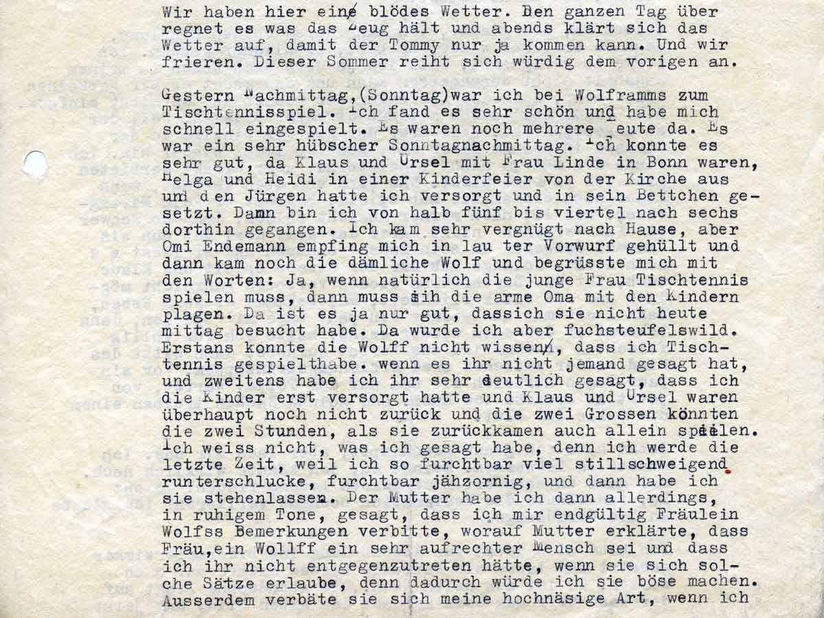 Gestern Nachmittag (Sonntag) war ich bei Wolframms zum Tischtennisspiel. Ich fand es sehr schön und habe mich schnell eingespielt. Es waren noch mehrere Leute da. Es war ein sehr hübscher Sonntagnachmittag. Ich konnte gut weg, weil Klaus und Ursel mit Frau Linde in Bonn waren, Helga und Heidi in einer Kinderfeier von der Kirche aus, und den Jürgen hatte ich versorgt und in sein Bettchen gesetzt. Dann bin ich von halb fünf bis viertel nach sechs dorthin gegangen. Ich kam sehr vergnügt nach Hause, aber Omi Endemann empfing mich in lauter Vorwurf gehüllt, und dann kam noch die dämliche Wolf mit den Worten: "Natürlich, wenn die junge Frau Tisch-tennis spielt, muss sich eben die arme Oma mit den Kindern plagen. Da ist es ja nur gut, dass ich sie heute besucht habe." Da wurde ich aber fuchsteufelswild. Erstens konnte die Wolf nicht wissen, dass ich Tischtennis gespielt habe, wenn es ihr nicht jemand gesagt hat, und zweitens habe ich ihr sehr deutlich gesagt, dass ich die Kinder erst versorgt hatte, Klaus und Ursel waren überhaupt noch nicht zurück, und die zwei Großen konnten auch allein spielen, als sie zurückkamen. Ich weiß nicht, was ich gesagt habe, denn ich werde die letzte Zeit, weil ich so viel runterschlucke, furchtbar jähzornig, und dann habe ich sie stehenlassen. Der Mutter habe ich dann allerdings in ruhigem Ton gesagt, dass ich mir endgültig Fräulein Wolfs Bemerkungen verbitte, worauf Mutter erklärte, dass Fräulein Wolf ein sehr aufrechter Mansch sei und dass ich ihr nicht Entgegenzutreten hätte, wenn sie sich solche Sätze erlaube, denn dadurch würde ich sie böse machen. Außerdem verbäte sie sich meine hochnäsige Art, wenn ich