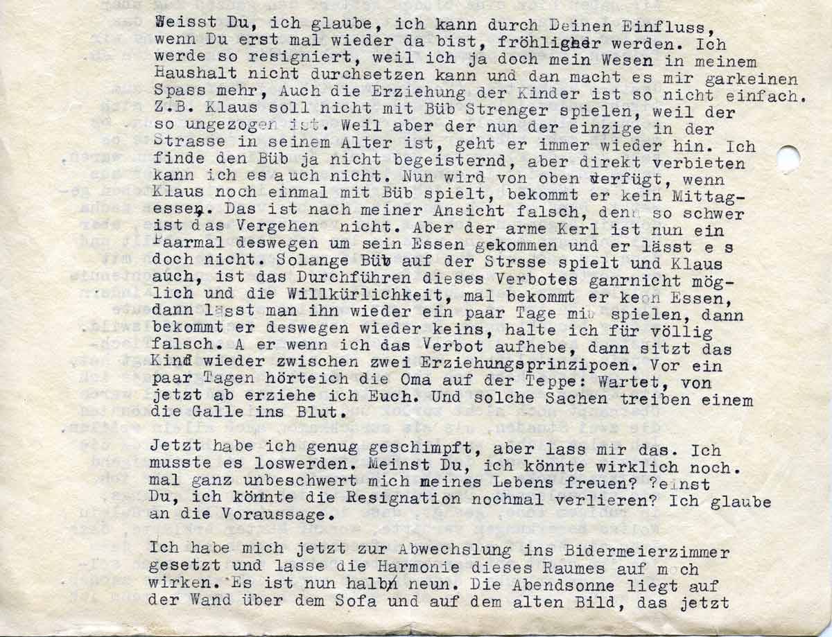 Weisst Du, ich glaube, ich kann durch Deinen Einfluss, wenn Du erst mal wieder da bist, fröhlicher werden. Ich werde so resigniert, weil ich ja doch mein Wesen in meinen Haushalt nicht durchsetze kann und dann macht es mmir garkeinen Spass mehr. Auch die Erziehung der Kinder ist nicht so einfach. Z.B. Klaus soll nicht mit Büb Strenger spielen, weil der so ungezogen sei. Weil der aber nun der einzige in seinem Alter in der Straße ist, geht er immer wieder hin. Ich finde den Büb ja nicht begeisternd, aber direkt verbieten kann ich es auch nicht. Nun wird von oben verfügt, wenn Klaus noch einmal mit Büb spielt, bekommt er kein Mittagessen. Das ist nach meiner Ansicht falsch, denn so schwer ist das Vergehen nicht. Aber der arme Kerl ist deshalb ein paarmal um sein Essen gekommen, und er lässt es doch nicht. Solange Büb auf dieser Straße spielt und Klaus auch, ist das Durchführen des Verbotes gar nicht möglich, und die Willkürlichkeit, mal bekommt er kein Essen, dann lässt man ihn wieder ein paar Tage mit spielen, dann bekommt er deswegen wieder keins, halte ich für völlig falsch. Aber wenn ich das Verbot aufhebe, dann sitzt das Kind wieder zwischen zwei Erziehungsprinzipien. Vor ein paar Tagen hörte ich die Oma auf der Treppe: Wartet, von jetzt ab erziehe i c h Euch. Und solche Sachen teiben einem die Galle ins Blut.