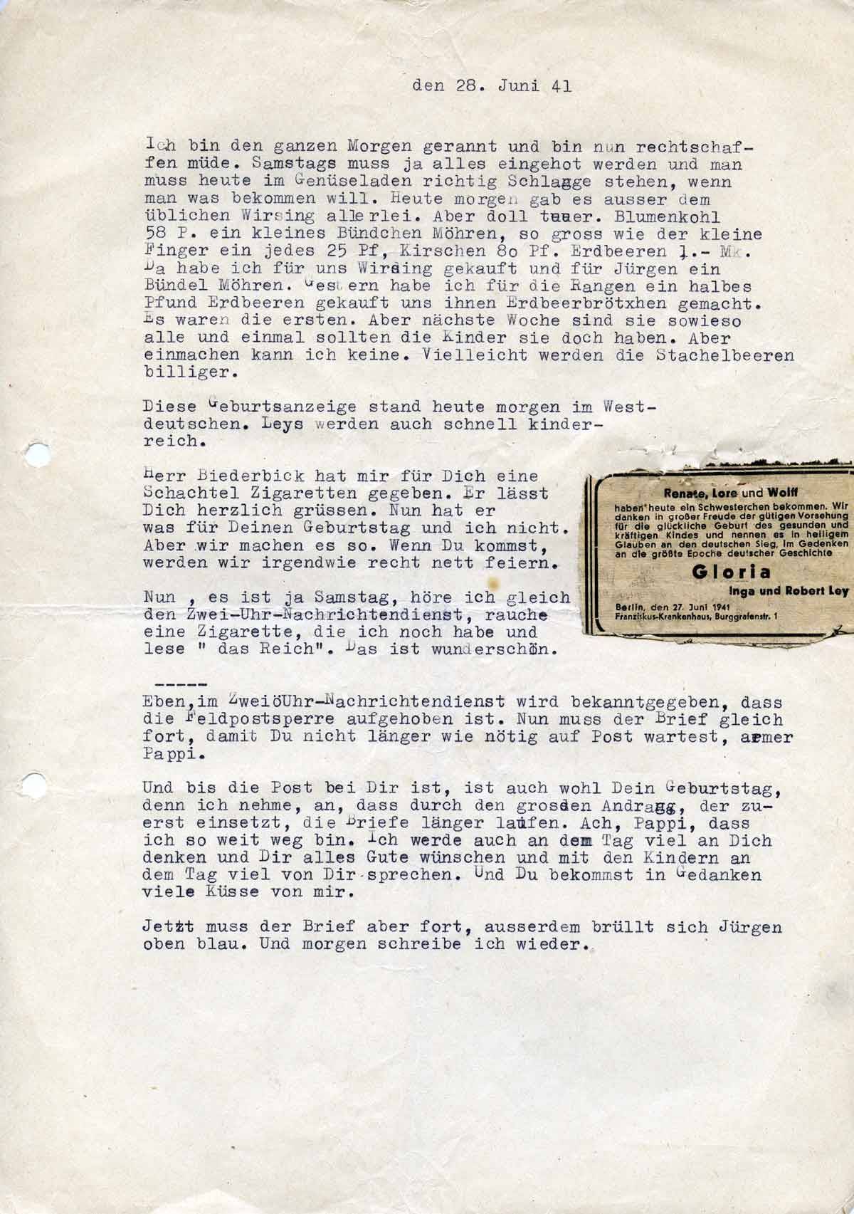 (Aufgeklebt eine Zeitungsanzeige: Renate, Lore und Wolff haben heute ein Schwesterchen bekommen. Wir danken in großer Freude der gütigen Vorsehung für die glückliche Geburt des gesunden und kräftigen Kindes und nennen es in (!) heiligen Glauben an den deutschen Sieg, im Gedenken an die größte Epoche der deutschen Geschichte GLORIA. Inge und Robert Ley. Berlin, den 27. Juni 1941) --- - Robert Ley war Erzieher im Päda gewesen. Er stieg zum Reichsleiter derNSdAP auf.