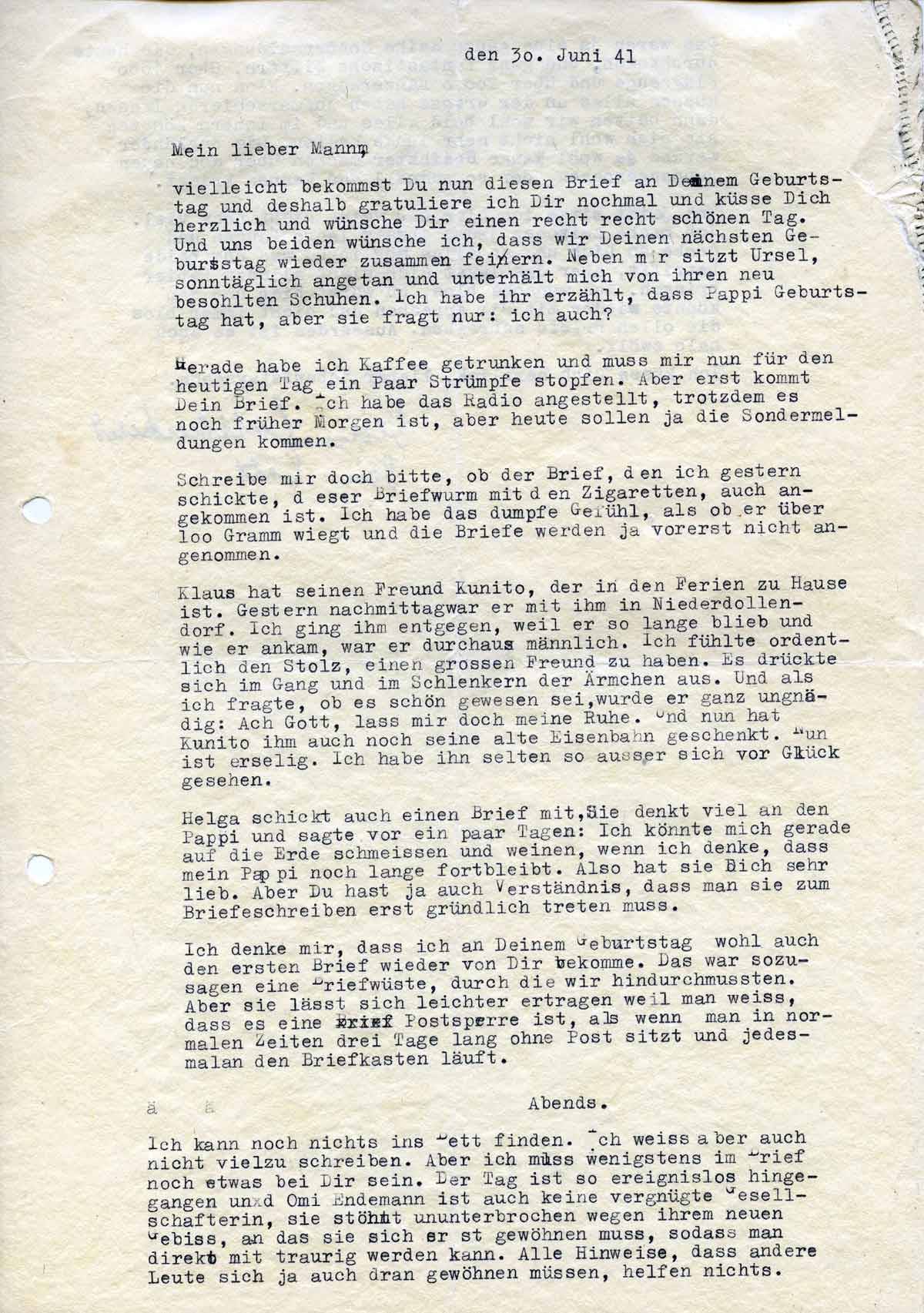 Charlotte Endemann an ihren Mann Harald, 30. Juni 1941