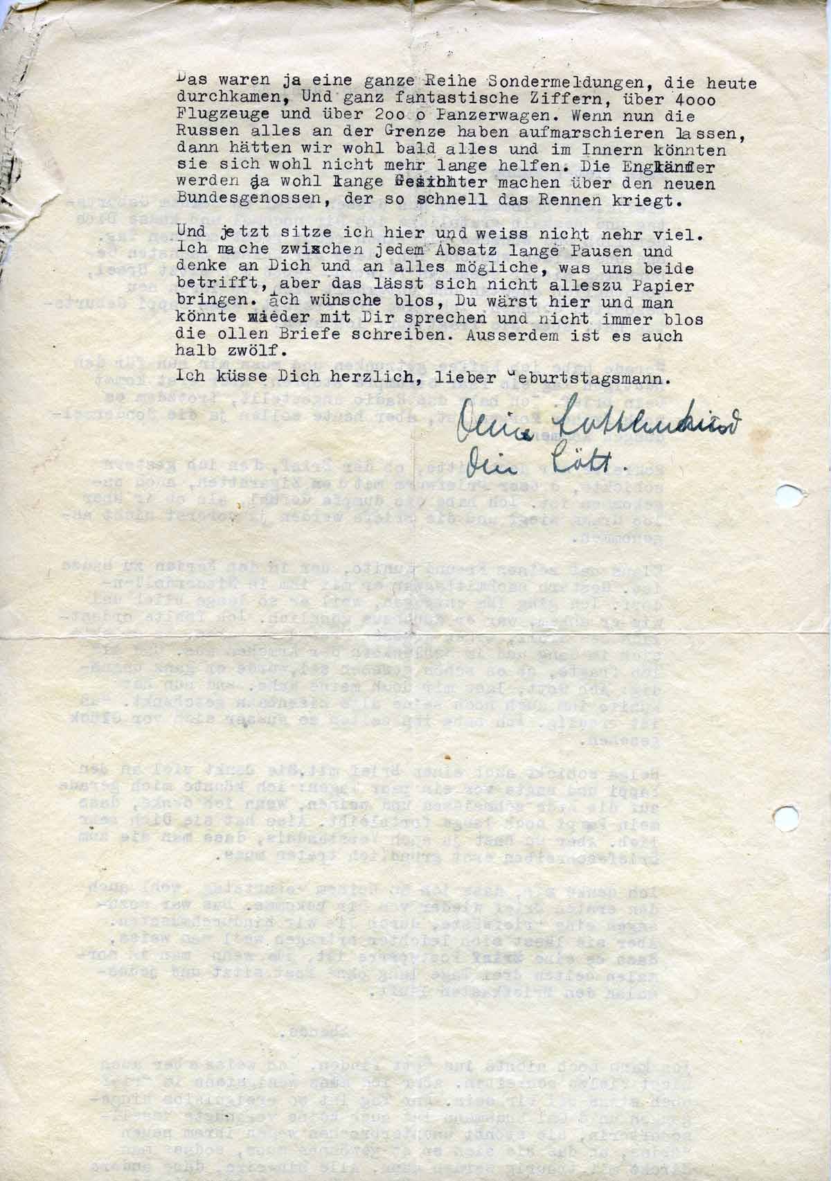 Und jetzt sitze ich hier und weiß nicht viel. Ich mache zwischen jedem Absatz lange Pausen und denke an Dich und an alles mögliche, was uns beide betrifft, aber das lässt sich nicht alles zu Papier bringen. Ich wünsche bloß, Du wärest mal wieder hier und man könnte mit Dir sprechen und nicht immer bloß die ollen Briefe schreiben. Außerdem ist es halb zwölf. Ich küsse Dich herzlich, lieber Geburtstagsmann! Deine Lottikind Din Lött.