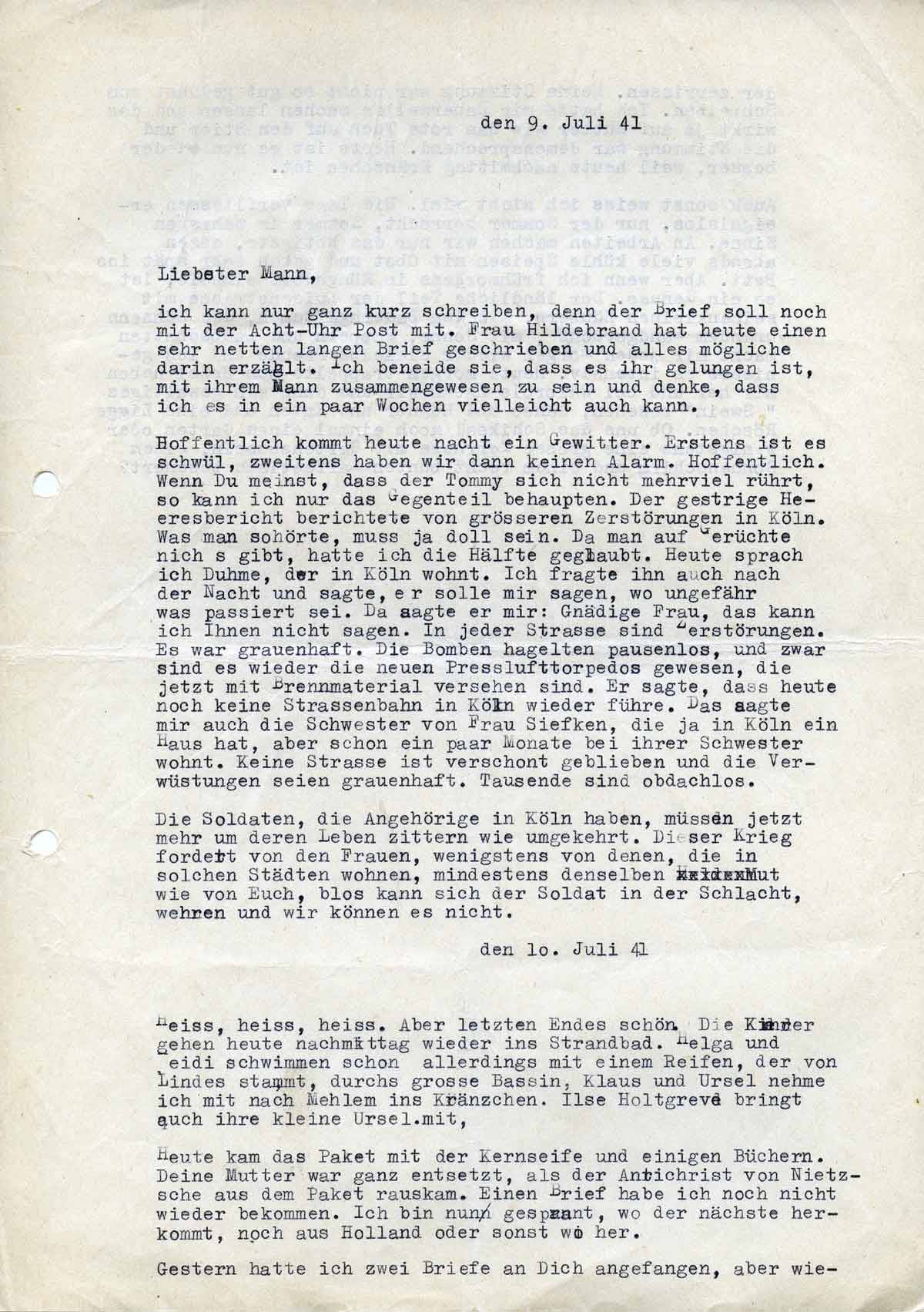 Die Soldaten, die Angehörige in Köln haben, müssen jetzt mehr um deren Leben zittern wie um ihr eigenes. Dieser Krieg fordert von den Frauen, wenigstens von denen, die in solchen Städten wohnen, mindestens denselben Mut wie von Euch, bloß kann sich der Soldat in der Schlacht wehren, und wir können es nicht.