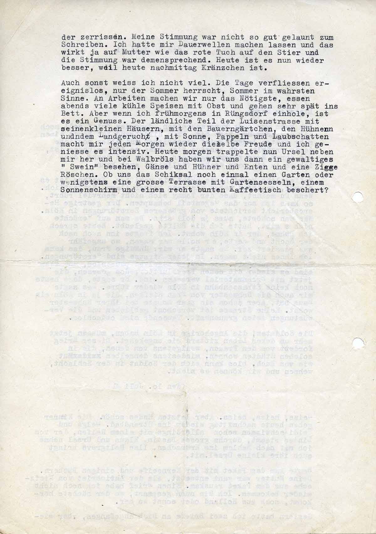 Auch sonst weiss ich nicht viel. Die Tage verfließen ereignislos, nur der Sommer herrscht, Sommer im wahrsten Sinne. An Arbeiten machen wir nur das Nötigste, essen abends viele kühle Speisen mit Obst und gehen sehr spät ins Bett. Aber wenn ich frühmorgens in Rüngsdorf einhole, ist es ein Genuss. Der ländliche Teil der Luisenstraße mit seinen kleinen Häusern, den Bauerngärtchen, den Hühnern und dem Landgeruch, mit Sonne, Pappeln und Laubschatten macht mir jeden Morgen wieder dieselbe Freude und ich genieße es. Heute morgen trappelte nun Ursel neben mir her und bei Walbröhls haben wir uns dann ein gewaltiges "Swein" besehen, Gänse, Hühner und Enten und eine Ziege "Röschen". Ob uns das Schicksal noch einmal einen Garten oder wenigstens eine Terrasse mit Gartensesseln, einem Sonnenschirm und einem recht bunten Kaffeetisch beschert?