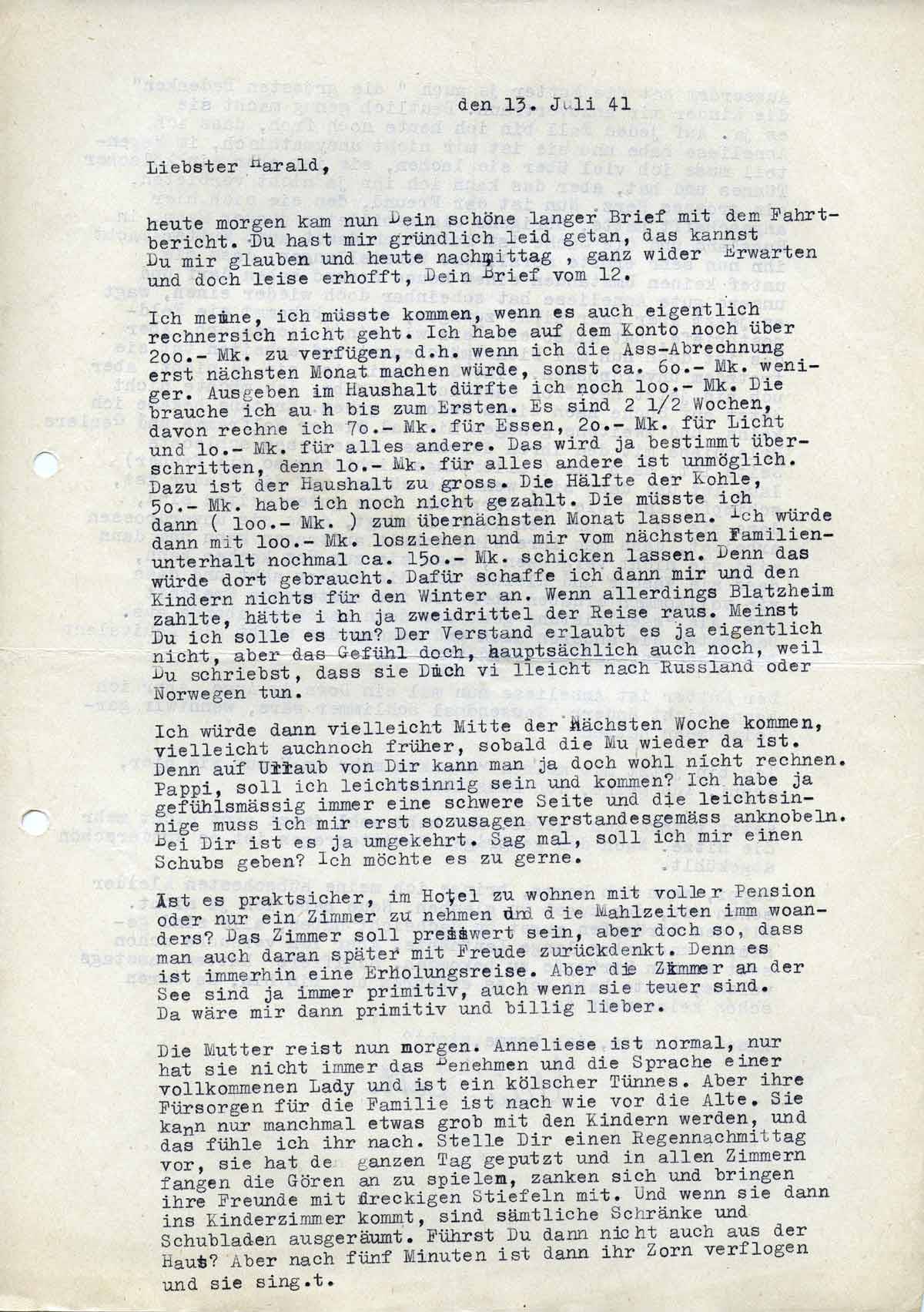 Charlotte Endemann an ihren Mann Harald, 13. Juli 1941