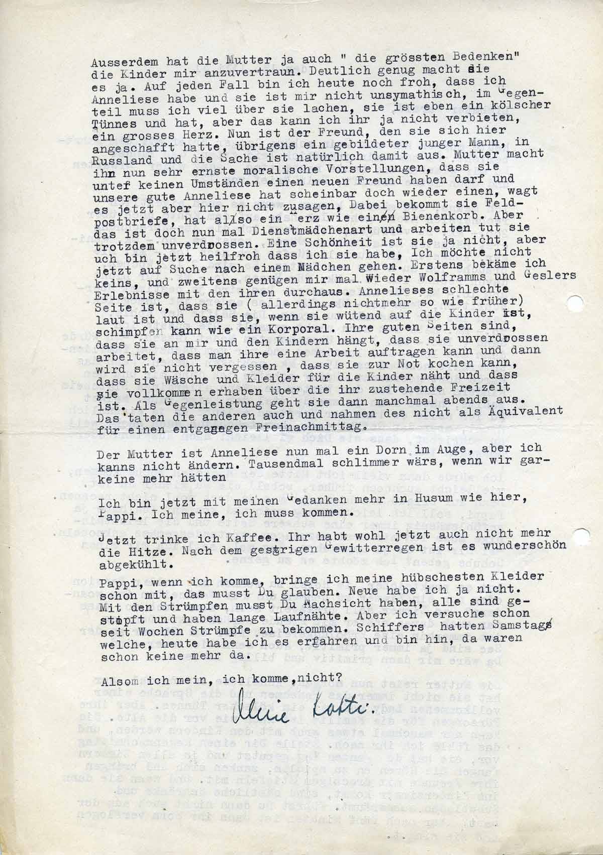Die Mutter reist nun morgen. Anneliese ist normal, nur hat sie nicht immer das Benehmen und die Ausdrucksweise einer vollkommenen Lady und ist ein kölscher Tünnes. Aber ihre Fürsorge für die Familie ist nach wie vor die alte. Sie kann nur manchmal etwas grob mit den Kindern werden, und das fühle ich ihr nach. Stelle Dir einen Regennachmittag vor, sie hat den ganzen Tag geputzt, und in allen Zimmern fangen die Gören an zu spielen, zanken sich und bringen ihre Freunde mit dreckigen Stiefeln mit. Und wenn sie dann ins Kinderzimmer kommt, sind sämtliche Schränke und Schubladen ausgeräumt. Führst Du dann nicht auch aus der Haut? Aber nach fünf Minuten ist dann ihr Zorn vorflogen, und sie singt.