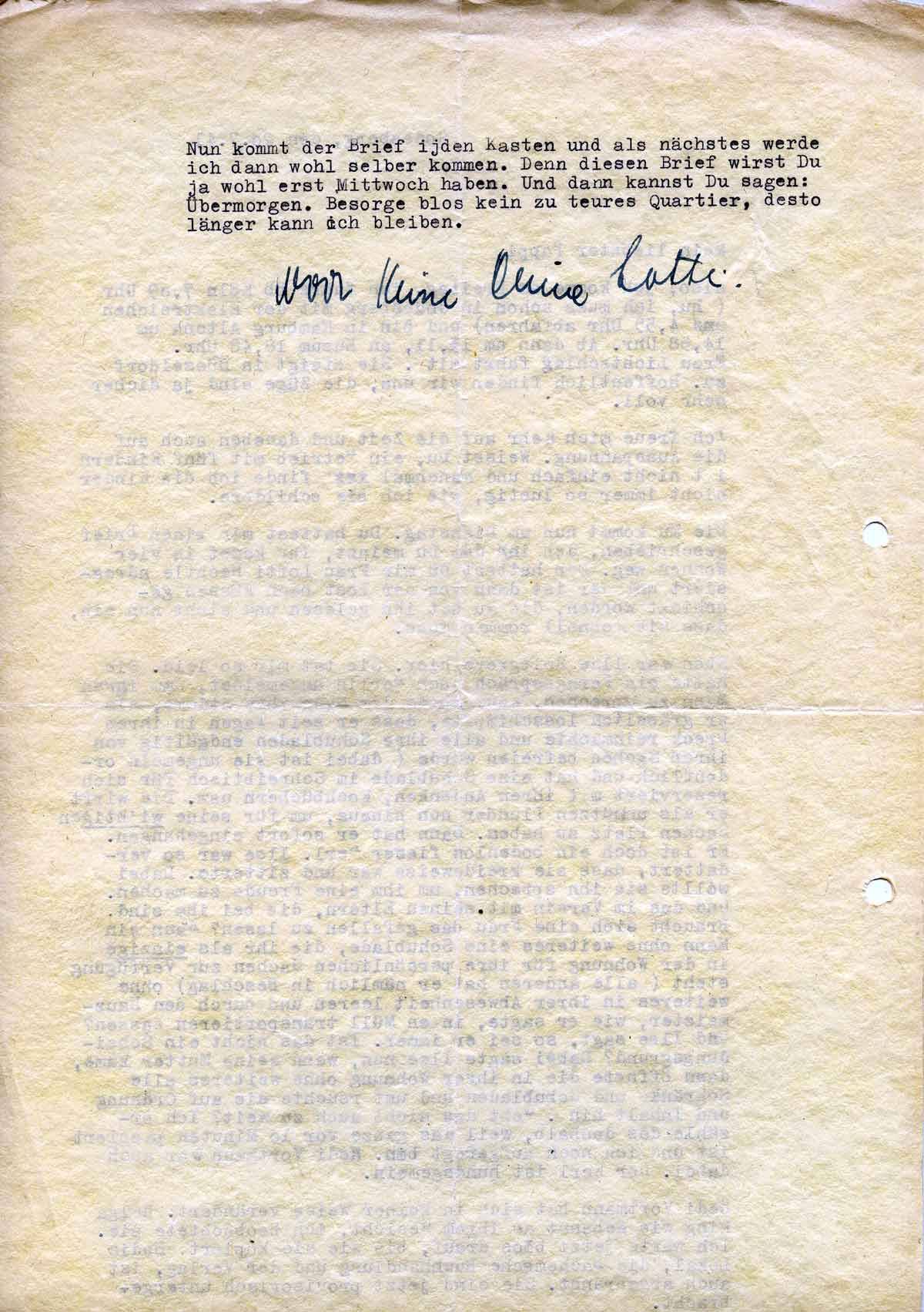 Eben war Ilse Holtgreve hier. Sie tat mir so leid. Sie hatte ein Ferngespräch nach Berlin angemeldet, um ihren Mann zu sprechen. Kaum hörte er ihre Stimme, als er grässlich losschimpfte, dass er seit Tagen in ihrem Dreck reinmachte und alle ihre Schubladen endgültig von ihren Sachen befreien würde. (Dabei ist sie ordentlich und hat nur eine Schublade im Schreibtisch für sich reserviert mit ihren Andenken, Kochbüchern usw.) Die wirft er als unnützen Plunder nun hinaus, um für seine wichtigen Sachen Platz zu haben. Dann hat er sofort eingehangen. Er ist doch ein bodenlos fieser Kerl. Ilse war so verdattert, dass sie kreideweiß war und zitterte. Dabei wollte sie ihn sprechen, um ihm eine Freude zu machen. Und das im Verein mit seinen Eltern, die bei ihm sind. Braucht sich eine Frau das gefallen zu lassen? Kann ein Mann ohne weiteres eine Schublade, die ihr als einzige in der Wohnung für ihre persönlichen Sachen zur Verfügung steht, alle anderen hat er nämlich beschlagnahmt, ohne weiteres in ihrer Abwesenheit leeren und durch den Hausmeister, wie er sagt, in den Müll transportieren lassen? Und Ilse sagt, so sei er immer. Ist das nicht ein Scheidungsgrund? Dabei sagt Ilse nun, wenn seine Mutter käme, dann öffnete die in ihrer Wohnung ohne weiteres alle Schränke und Schubladen und untersuchte sie auf Ordnung und Inhalt hin. Geht das nicht auch zu weit? Ich erzähle das deshalb, weil das ganze vor 10 Minuten passiert ist und ich noch aufgeregt bin. Hedi Vortmann war auch dabei. Der Kerl ist hundsgemein.