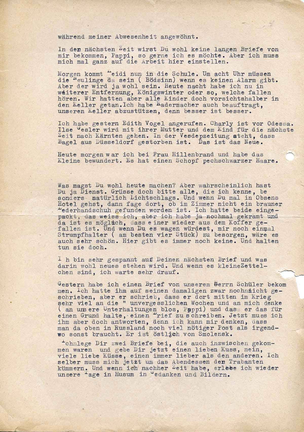 Ich lege Dir zwei Briefe bei, die auch inzwischen gekommen waren und gebe Dir jetzt einen lieben Kuss, nein, viele liebe Küsse, einen immer lieber als den anderen. Ich selber muss mich jetzt um das Abendessen der Trabanten kümmern. Und wenn ich nachher Zeit habe, erlebe ich immer wieder unsere Tage in Husum in Gedanken und Bildern.