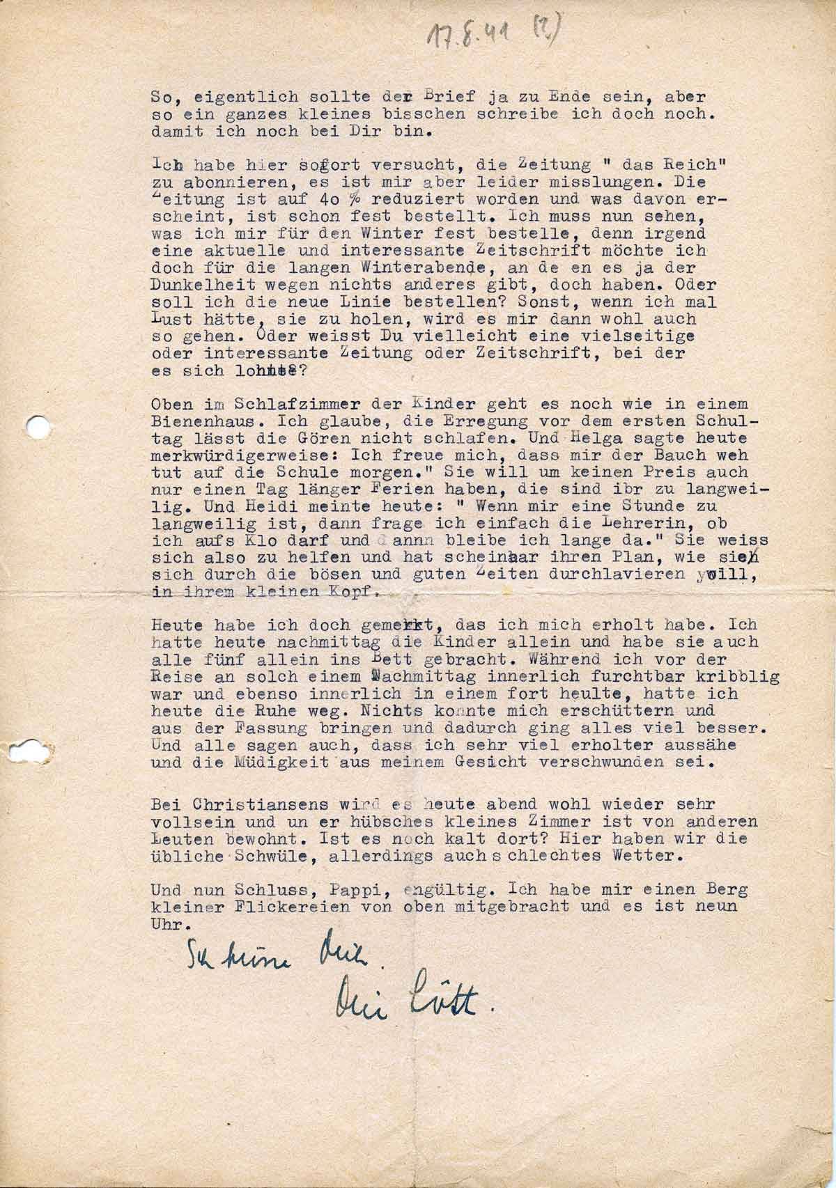Charlotte Endemann an ihren Mann Harald, 17. August 1941