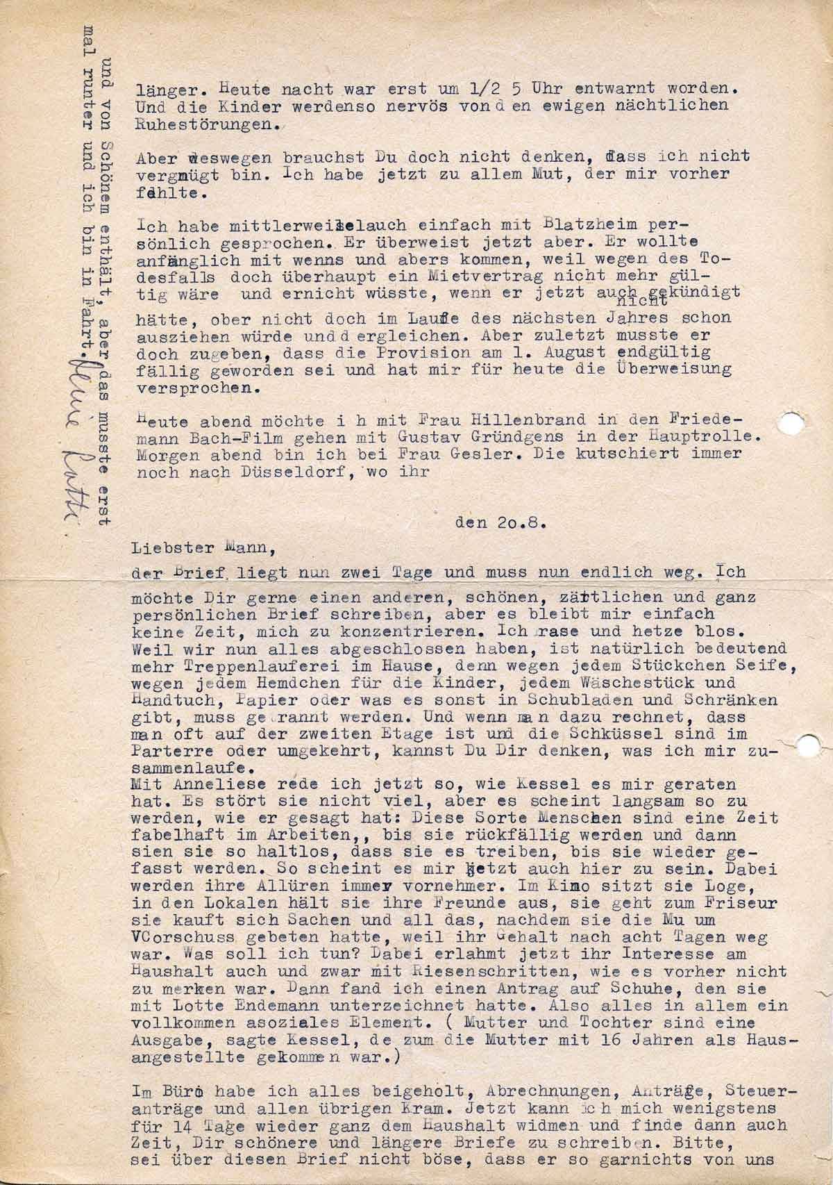 der Brief liegt nun zwei Tage und muss endlich weg. Ich möchte Dir gern einen anderen, schönen, zärtlichen und ganz persönlichen Brief schreiben, aber es bleibt mir einfach keine Zeit, mich zu konzentrieren. Ich rase und hetze bloß. Weil wir nun alles abgeschlossen haben, ist natürlich bedeutend mehr Treppenlauferei im Haus, denn wegen jedem Stückchen Seife, wegen jedem Hemdchen für die Kinder, jedem Wäschestück und Handtuch, Papier oder was es sonst ist, muss gerannt werden. Und wenn man dazu rechnet, dass man selber auf der zweiten Etage ist, und die Schlüssel sind im Parterre oder umgekehrt, kannst Du Dir denken, was ich mir zusammenlaufe.