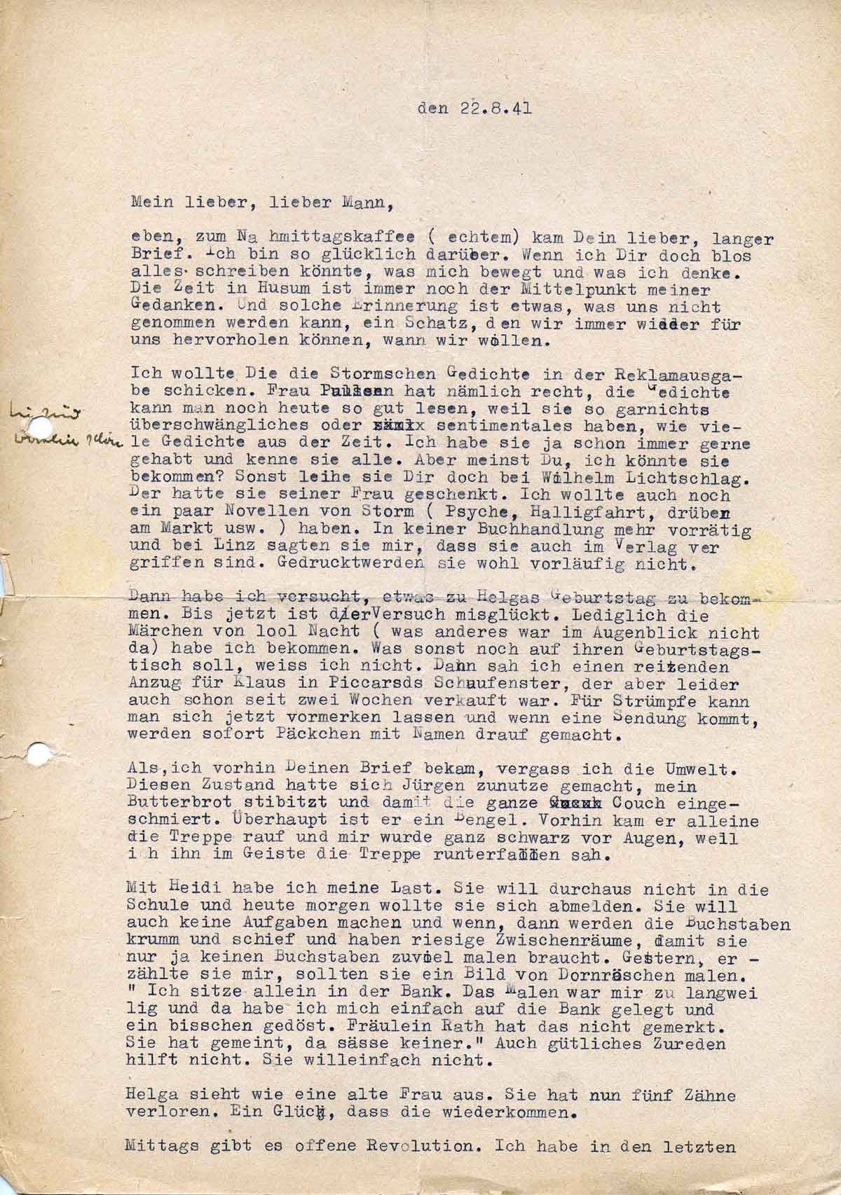 Charlotte Endemann an ihren Mann Harald, 22. August 1941