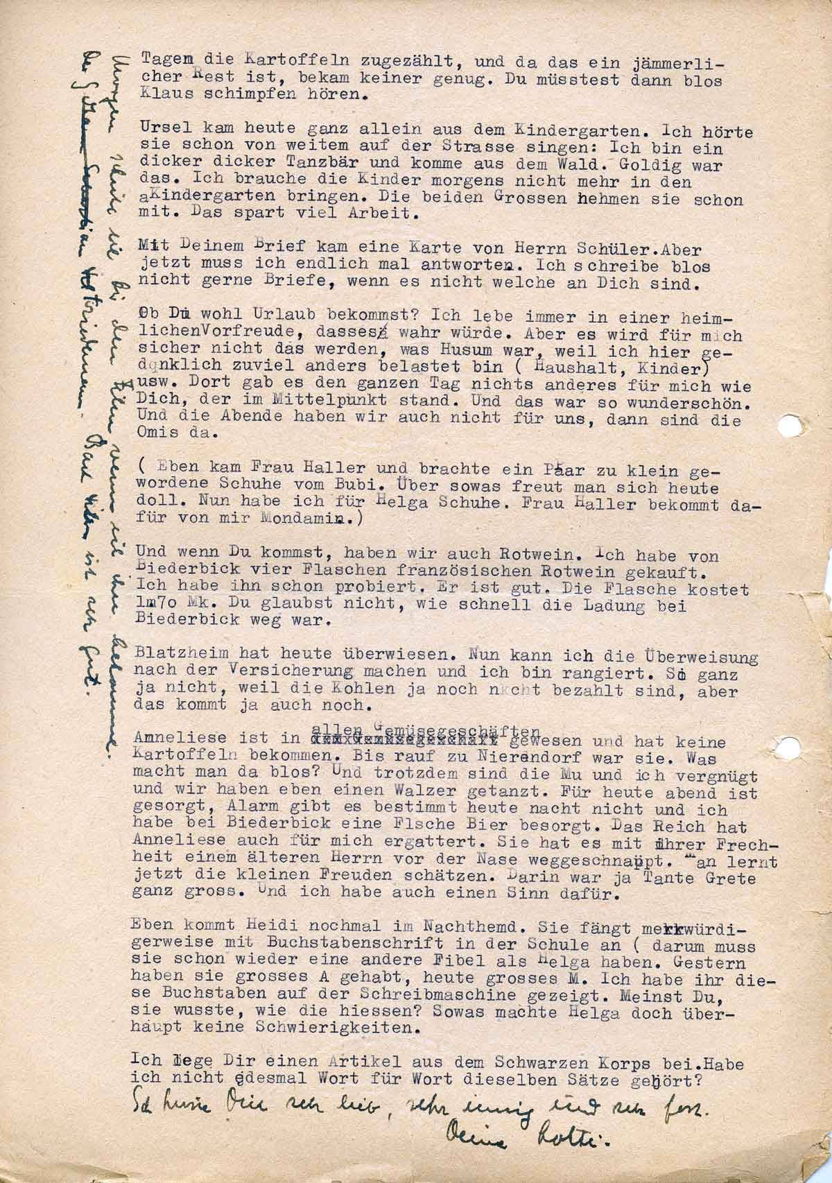 Ich wollte Dir die Stormschen Gedichte in der Reklamausgabe schicken. Frau Paulsen hat nämlich recht, die Gedichte kann man noch heute so gut lesen, weil sie so garnichts überschwängliches oder sentimentales haben, wie viele Gedichte aus der Zeit. Ich habe sie ja schon immer gerne gehabt und kenne sie alle. Aber meinst Du, ich könnte sie bekommen? Sonst leihe sie Dir doch bei Wilhelm Lichtschlag. Der hatte sie seiner Frau geschenkt. Ich wollte auch noch ein paar Novellen von Storm (Psyche, Halligfahrt, drüben am Markt usw.) haben. In keiner Buchhandlung mehr vorrätig und bei Linz sagten sie mir, dass die auch im Verlag vergriffen sind. Gedruckt werden sie wohl vorläufig nicht.