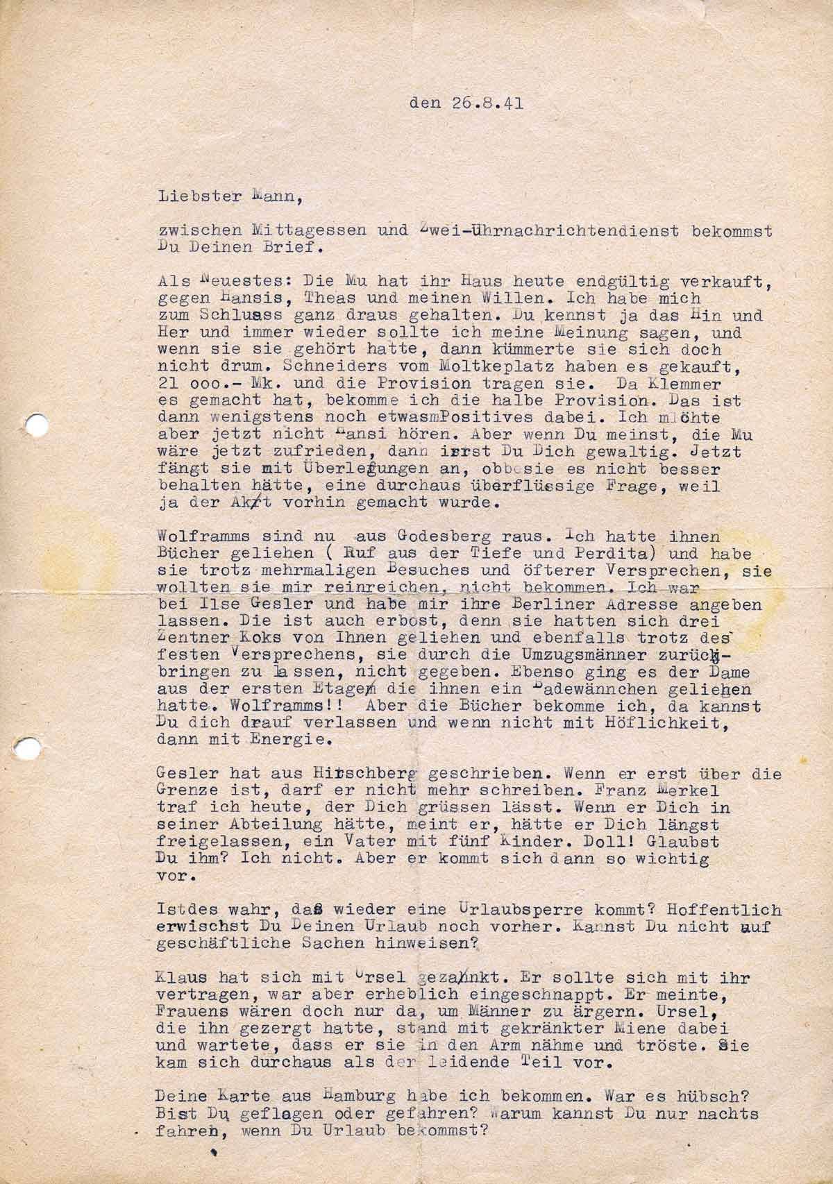 Charlotte Endemann an ihren Mann Harald, 26. August 1941