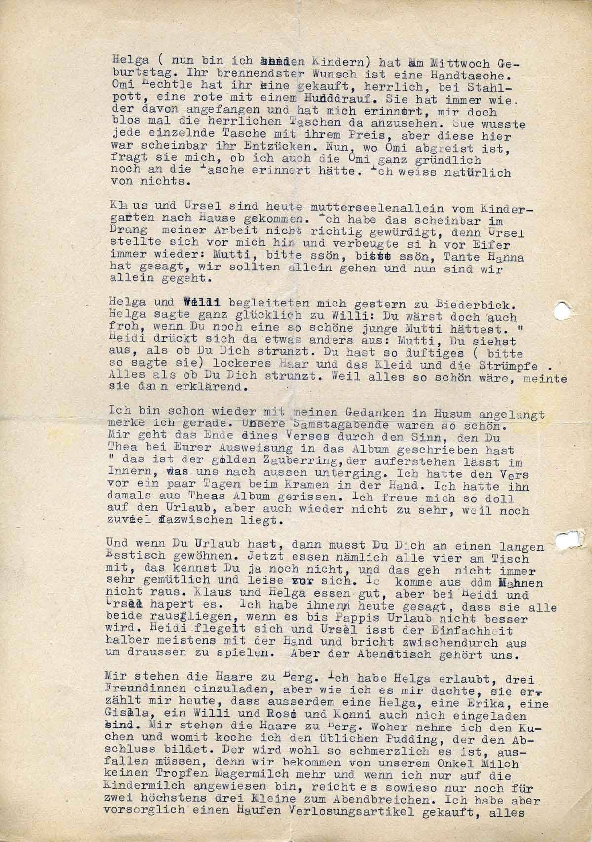 Ich habe heute durch Postanweisung 50.- Mk. an Dich geschickt. Ich habe nämlich mein Geld bekommen. Dann habe ich mich recht schön gemacht, wie Du es gerne hast, und bin mit Jürgen in die Stadt gezogen, Einkäufe zu machen. Ich traf Kurt Wiesenthal, der Dich grüßen lässt, und Fritz Frenking, der das ebenfalls tut. Der wünscht, seine Frau hätte nur ein bisschen mehr gute Laune, aber die sei mit schlechter Laune auf die Welt gekommen. Jetzt weint sie den ganzen Tag, weil sie nicht genug Kartoffeln kaufen kann.