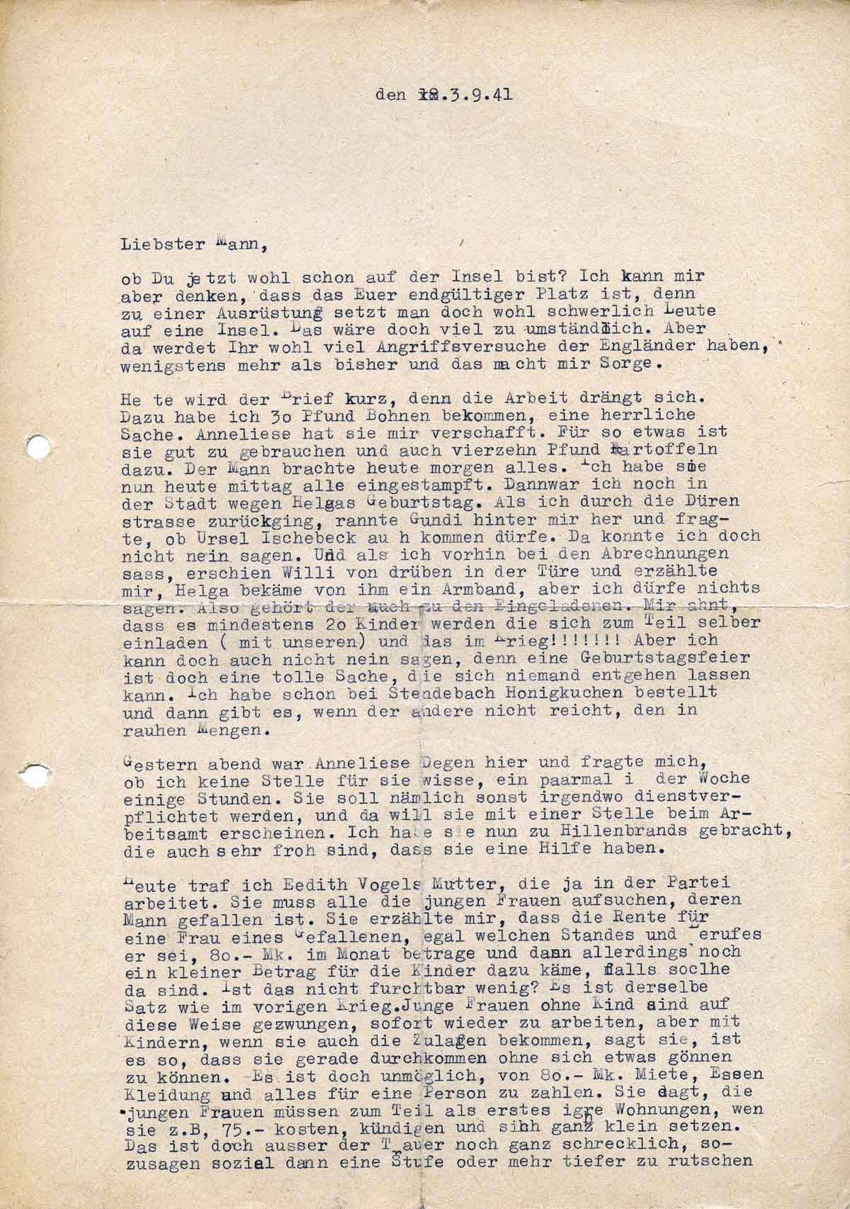 Charlotte Endemann an ihren Mann Harald, 3. September 1941