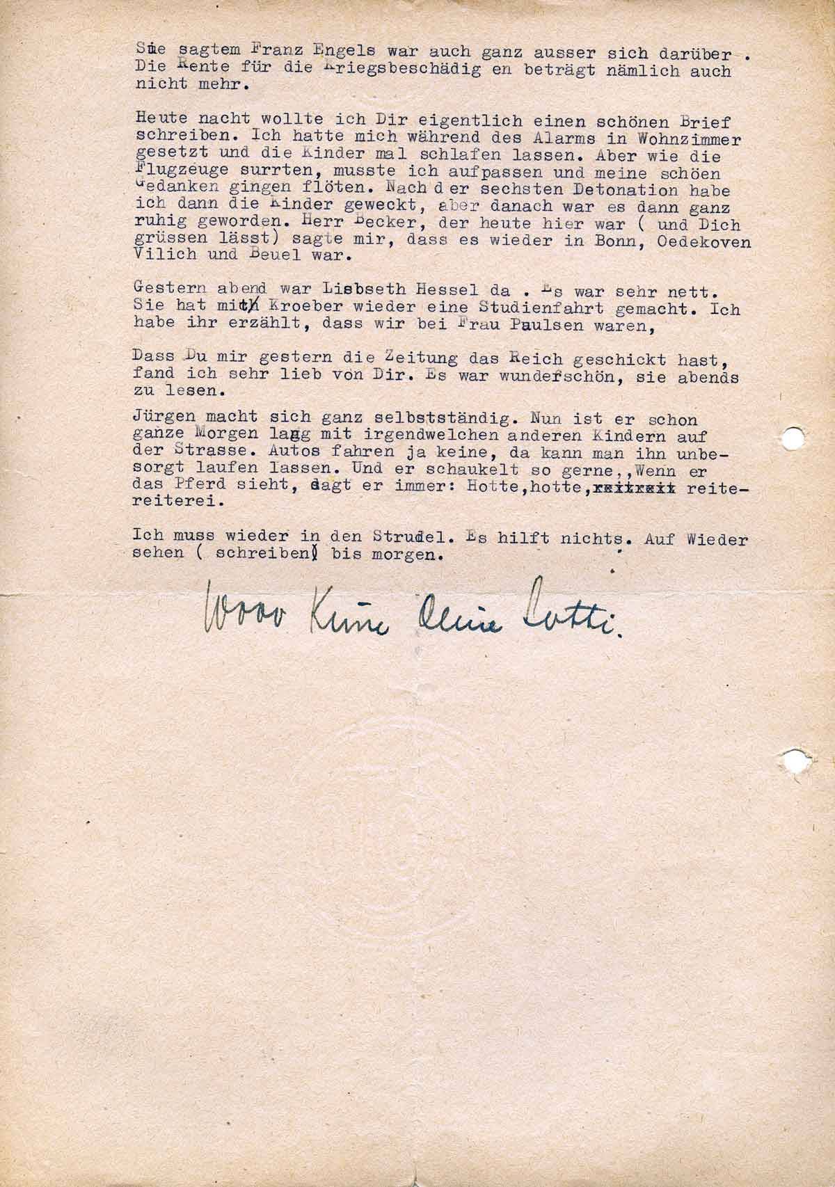Heute nacht wollte ich Dir eigentlich einen schönen Brief schreiben. Ich hatte mich während des Alarms ins Wohnzimmer gesetzt und die Kinder mal schlafen lassen. Aber wie die Flugzeuge surrten, musste ich aufpassen, und meine schönen Gedanken gingen flöten. Nach der sechsten Detonation habe ich dann die Kinder geweckt, aber danach war es dann ganz ruhig geworden. Herr Becker, der heute hier war und Dich grüßen lässt, sagte mir, dass es wieder in Bonn, Oedekoven, Villich und Beuel war.
