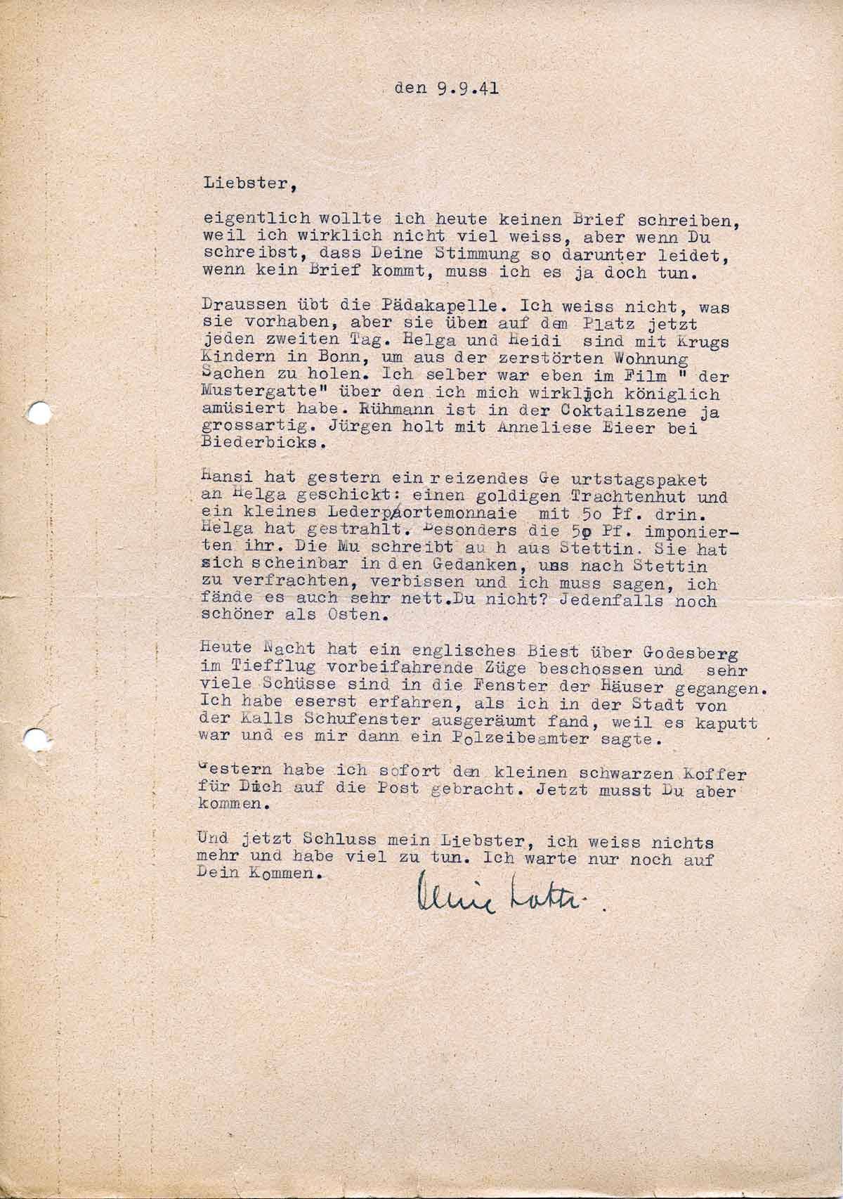 Charlotte Endemann an ihren Mann Harald, 9. September 1941