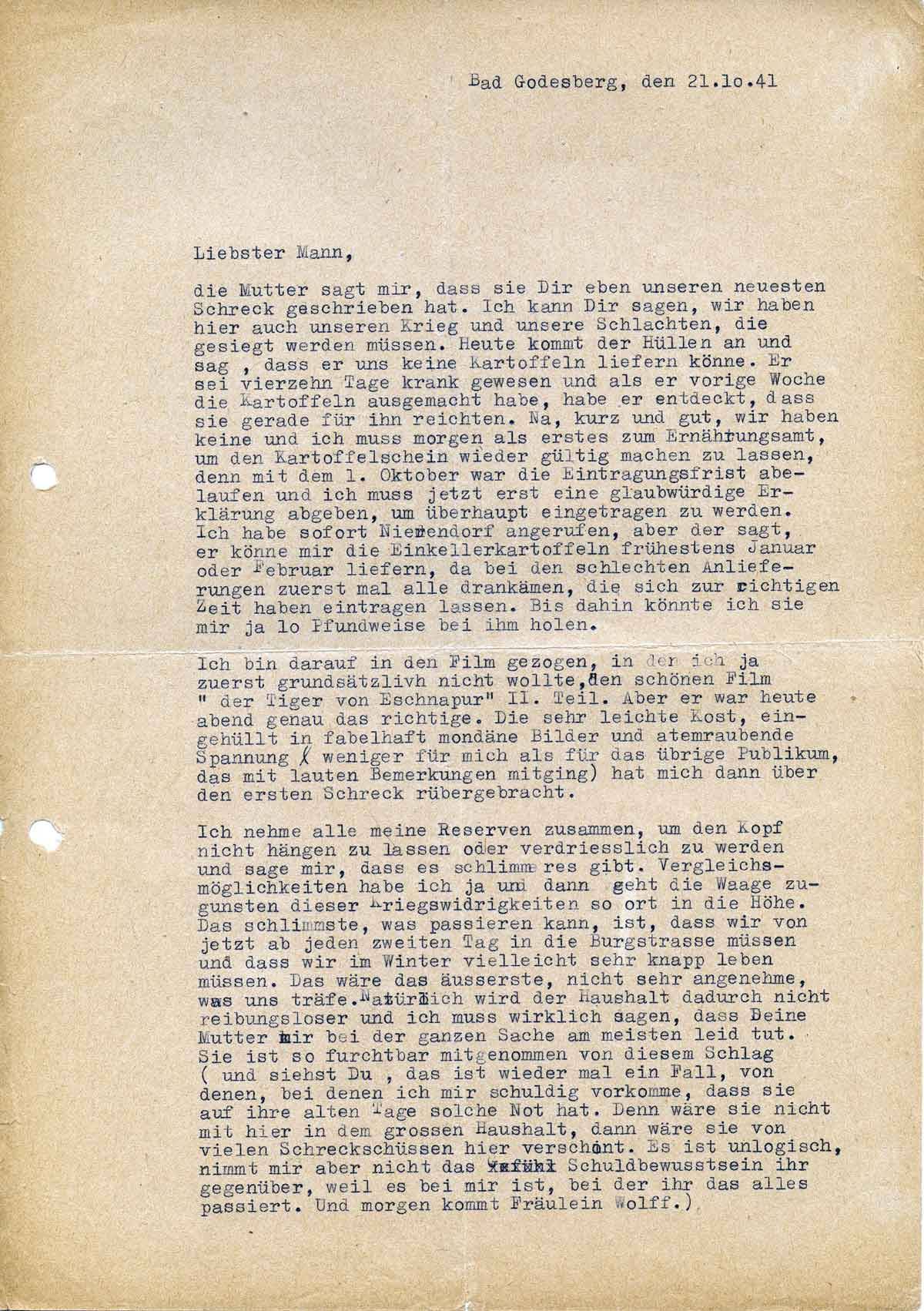 Die Mutter sagt mir, dass sie Dir eben unseren neuesten Schreck geschrieben hat. Ich kann Dir sagen, wir haben hier auch unseren Krieg, und unsere Schlachten, die gesiegt werden müssen. Heute kommt der Hüllen an und sagt, dass er uns keine Kartoffeln liefern könne, er sei vierzehn Tage krank gewesen, und als er vorige Woche die Kartoffeln ausgemacht habe, habe er entdeckt, dass sie gerade für ihn reichten. Das glaube einer!!!!! Na, kurz und gut, wir haben keine, und ich muss morgen als erstes zum Ernährungsamt, um den Kartoffelschein wieder gültig machen zu lassen, denn mit dem 1. Oktober war die Eintragungsfrist abgelaufen, und ich muss jetzt eine glaubwürdige Erklärung abgeben, um überhaupt eingetragen zu werden. Ich habe sofort Nierendorf angerufen, aber der sagt, er könne mir die Einkellerkartoffeln frühestens Januar oder Februar liefern, da bei den schlechten Anlieferungen zuerst mal alle drankommen, die sich zur richtigen Zeit haben eintragen lassen. Bis dahin könnte ich sie mir ja zehnpfundweise bei ihm holen (am oberen Ende der Burgstraße).