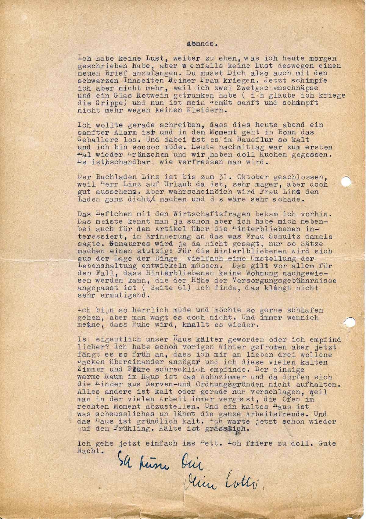 Was soll ich weiter schreiben? Es passiert so wenig, und am Tage, wie jetzt, habe ich wenig Zeit, mich auf einen richtigen Brief zu konzentrieren. Helga hat sich den Knöchel verknaxt. Ich lasse sie aber morgen wieder zur Schule gehen, trotzdem er noch dick ist. Ich selber stehe ratlos vor meinem Kleiderschrank und habe nichts Warmes für den Winter. Der Pullover ist nun an den Ärmeln geflickt und scheidet also für besser aus. Das Karierte ist nicht mehr zu flicken, trotzdem Mutter und ich die besten Vorsätze hatten. Voriges Jahr hatte ich mir kein Kleid besorgt, weil mir das Geld fehlte bezw. ich sparen wollte, und vor zwei Jahren hatte ich keins gekriegt, weil Jürgen unterwegs war. Wenn sogar Deine Mutter sagt, dass meine Wintergarderobe armselig ist, ist es wirklich wahr. Für besser habe ich das schwarze Kleid, das ich nun bei allen Gelegenheiten anziehe, aber leider muss ich da auch in kurzer Zeit die Ärmel flicken.