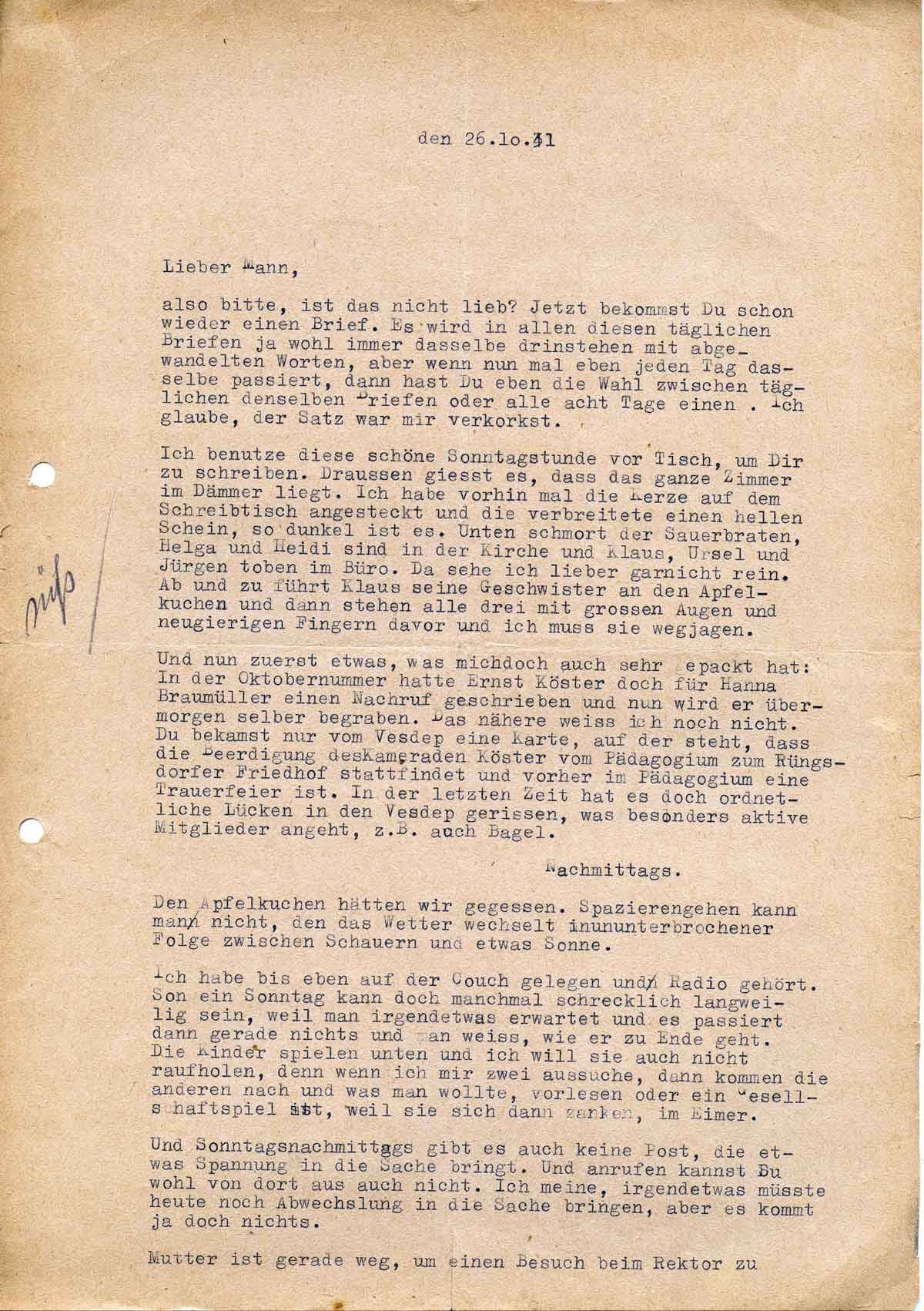 Charlotte Endemann an ihren Mann Harald, 26. Oktober 1941