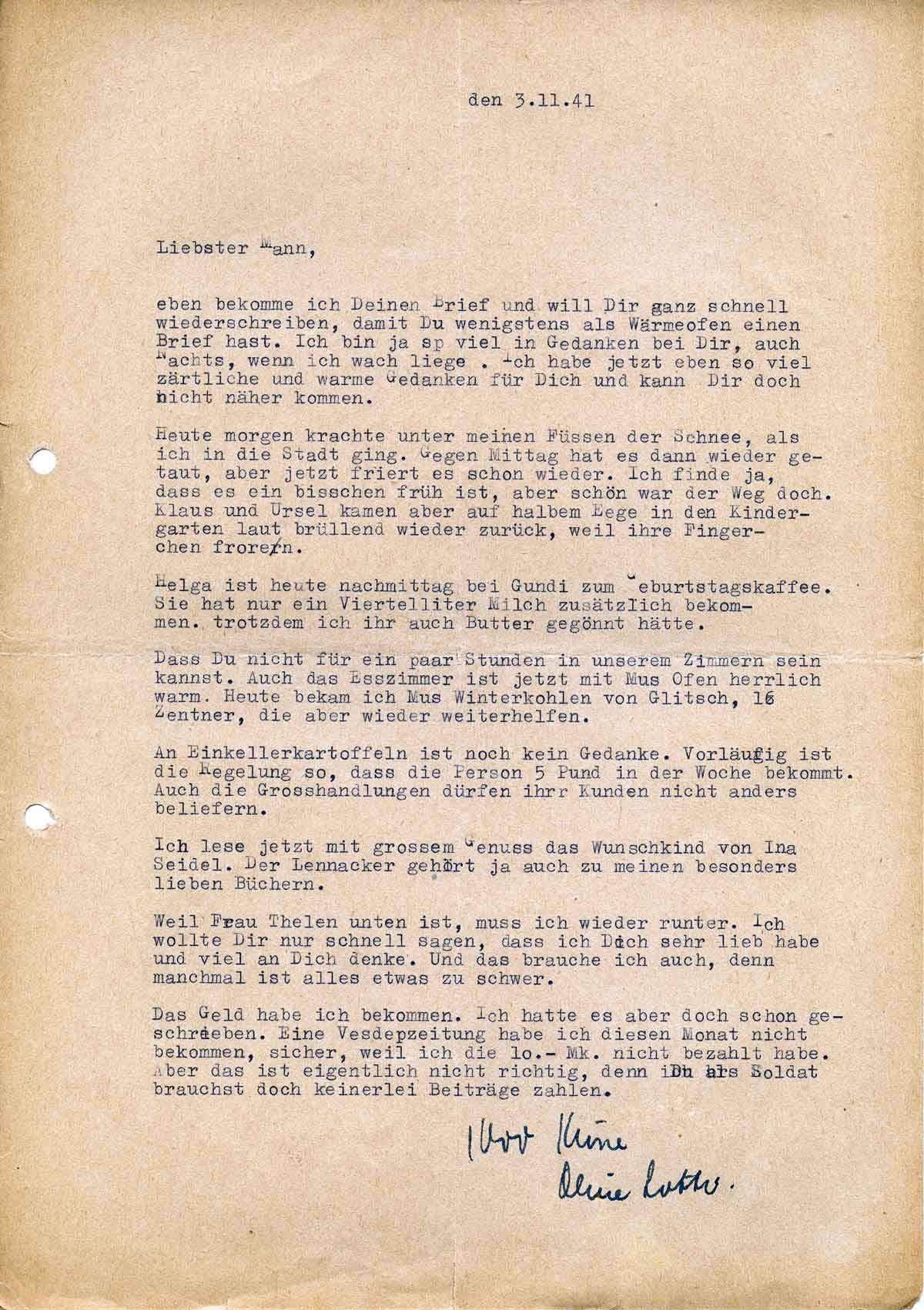 Charlotte Endemann an ihren Mann Harald, 3. November 1941