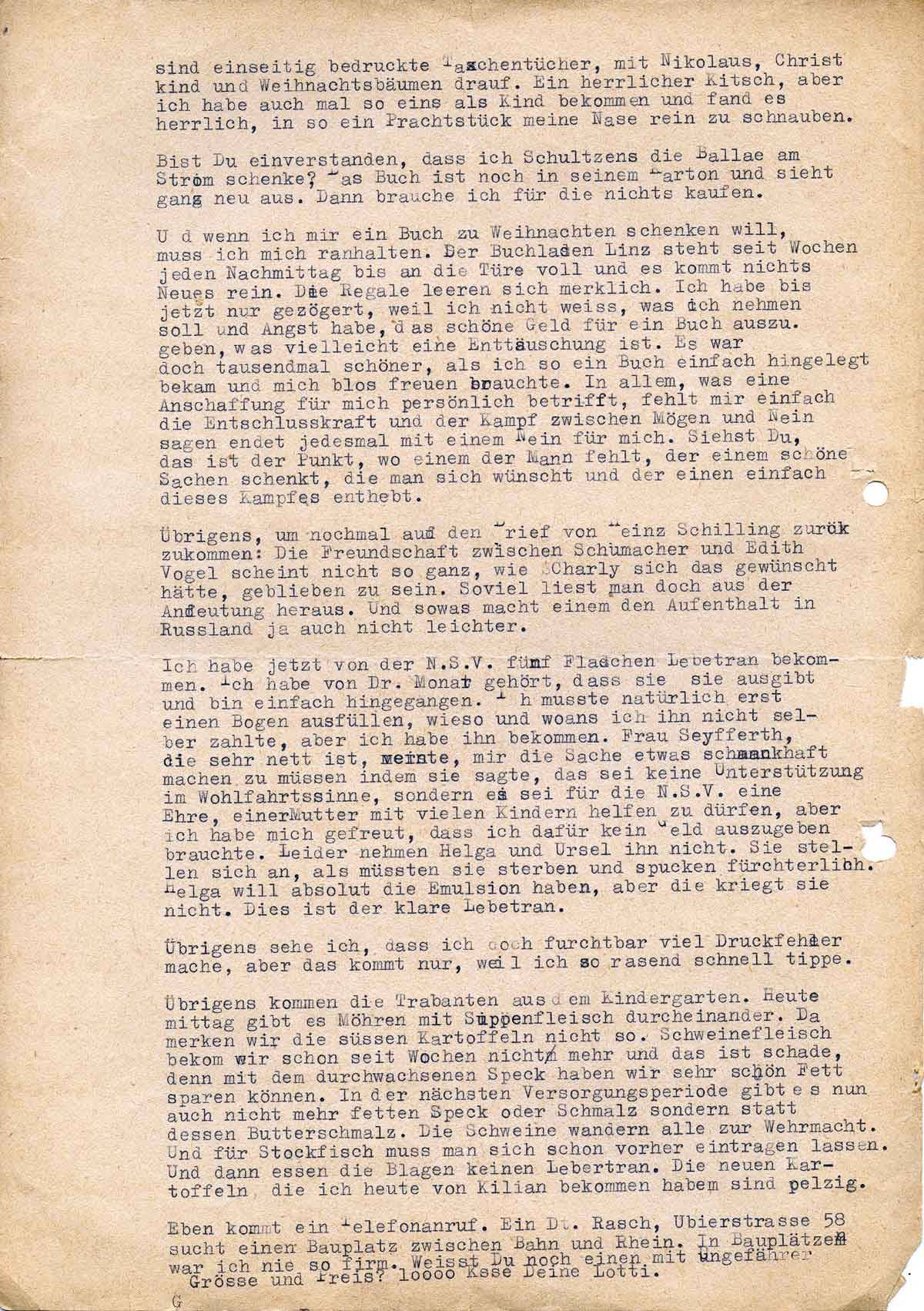 Der Brief von Heinz Schilling hat mich sehr interessiert, besonders auch, was das Ostland betrifft. Wer weiss, was sich uns noch für Zukunftsaussichten bieten. Hoffentlich. Und hoffentlich schöne, was die pekuniäre Seite anbelangt. Diesen Monat muss ich mich wieder verflixt einschränken, weil an Unvorhergesehenem die 30.- Mk. für Mus kohlen, 34.- Mk. Invalidenmarken für Anneliese, 28.- Mk. Hans Banthien und 10.- Mk Onkel Arthur kamen. Ist das nicht doll. Jetzt bin ich schon wieder ins Rechnen gerutscht, trotzdem ich es diesmal nicht wollte, aber als grosses Fragezeichen steht Weihnachten vor mir und ich müsste jetzt schon alles besorgen, weil in acht Tagen überhaupt nichts mehr da ist.