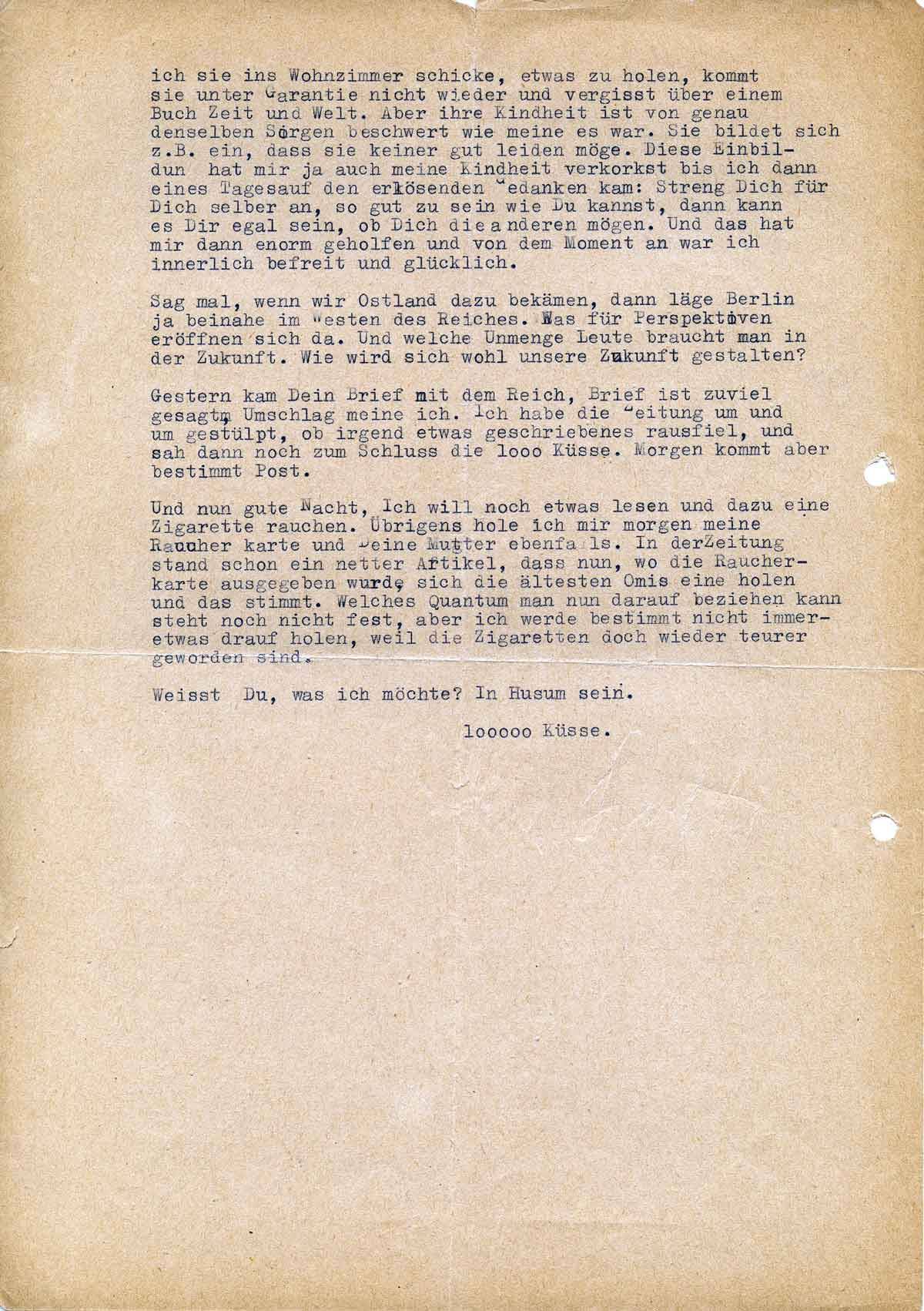 Und nun gute Nacht. Ich will noch etwas lesen und eine Zigarette rauchen. Übrigens hole ich mir morgen meine Raucherkarte und Deine Mutter ebenfalls. In der Zeitung stand schon ein netter Artikel, dass nun, wo die Raucherkarte ausgegeben wird, sich die ältesten Omas eine holen, und das stimmt. Welches Quantum man darauf beziehen kann, steht noch nicht fest.